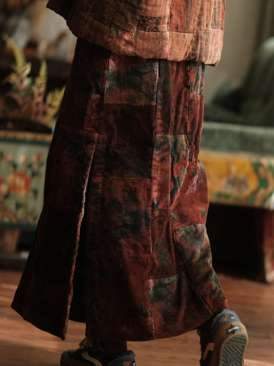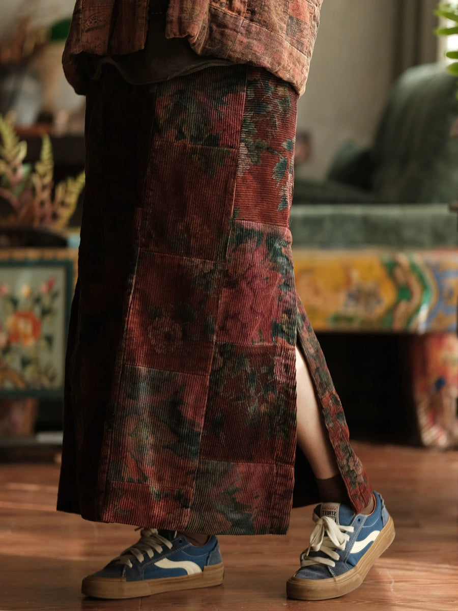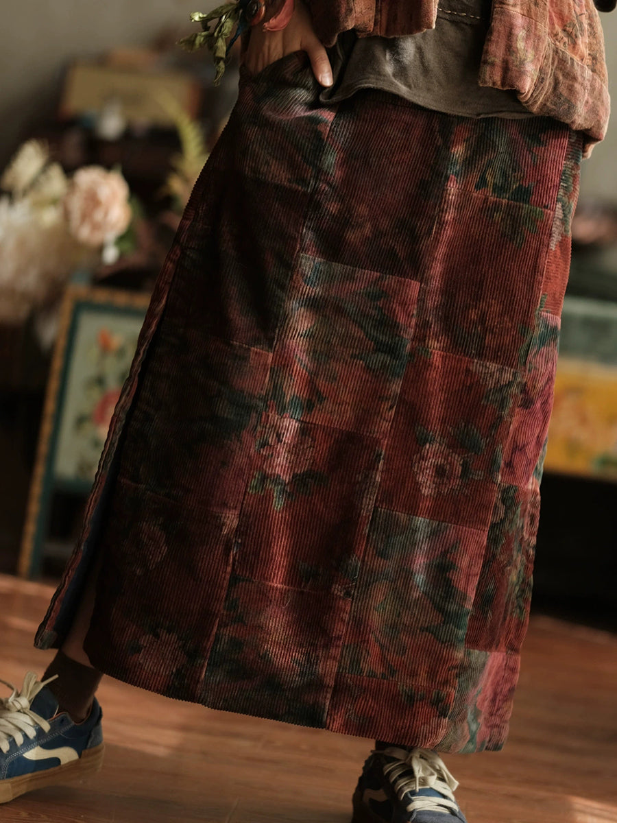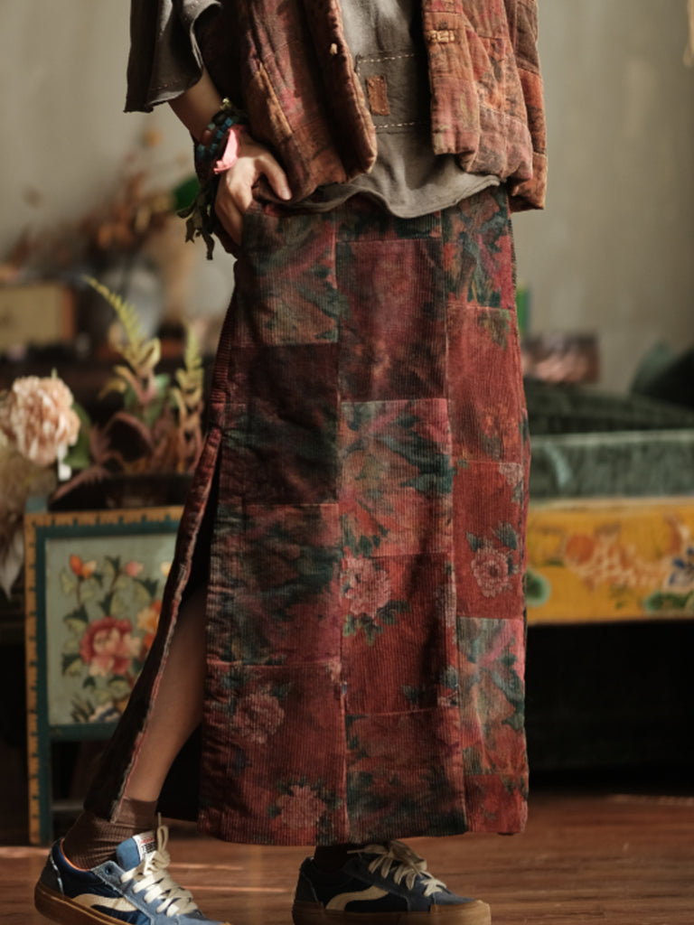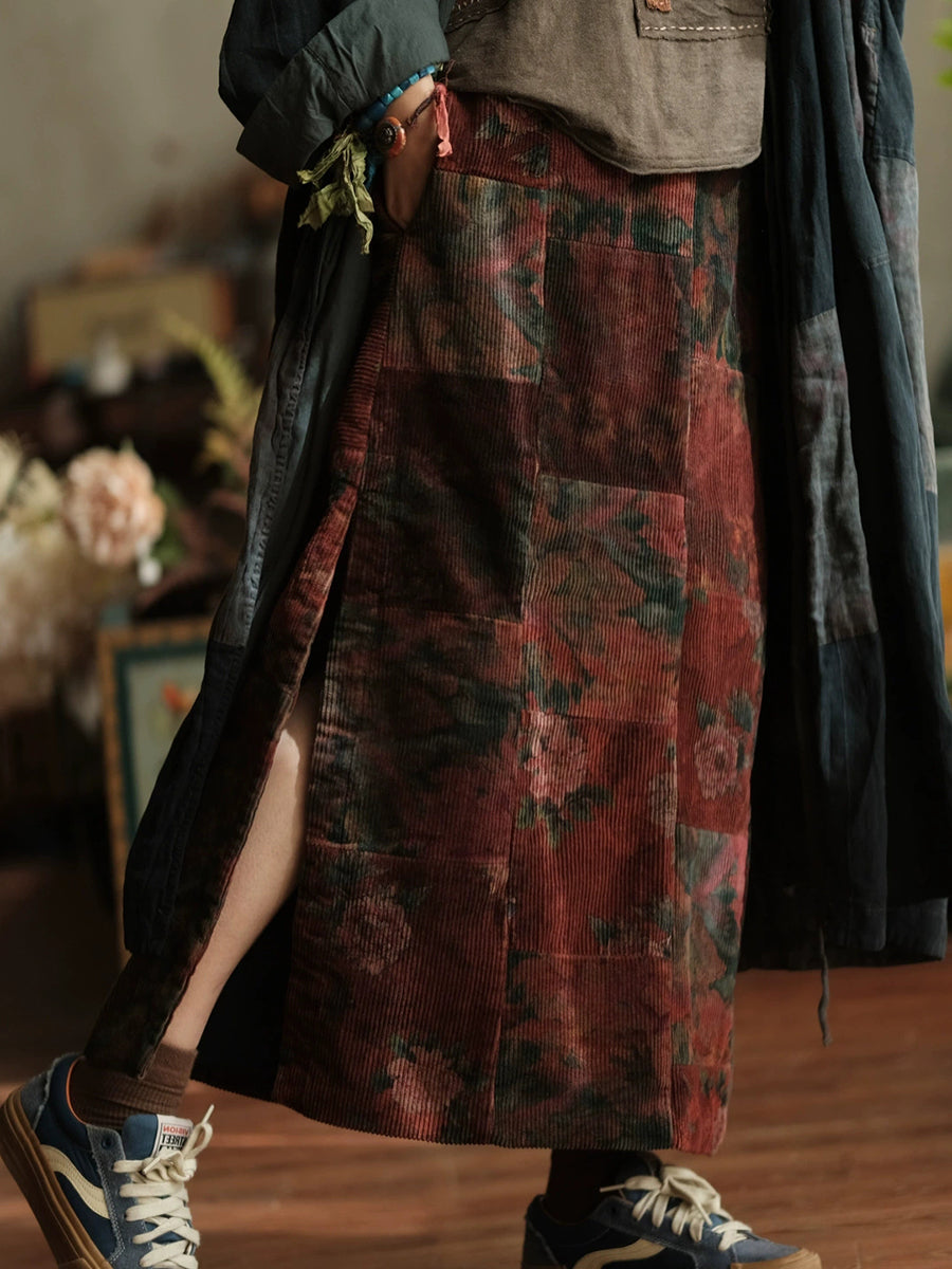 Women Autumn Retro Flower Patchwork Straight Skirt