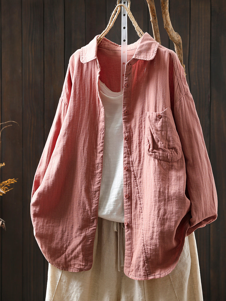 Women Retro Autumn Pure Color 100%Cotton Shirt