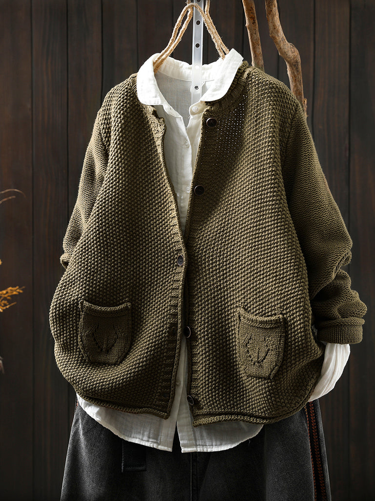 Women Vintage Flower Pocket O-Neck Knit Vest