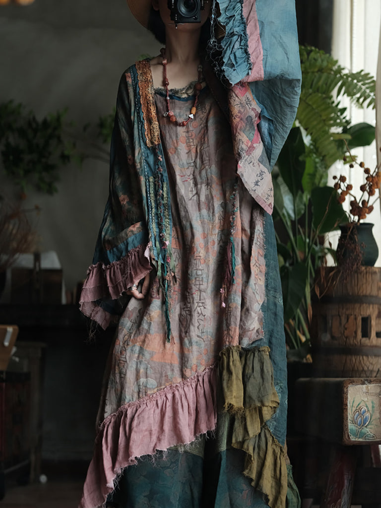 Women Summer Retro Flower Spliced Linen Shirt Coat