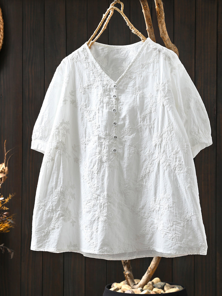 Plus Size Women Artsy Embroidery V-Neck 100%Cotton Shirt