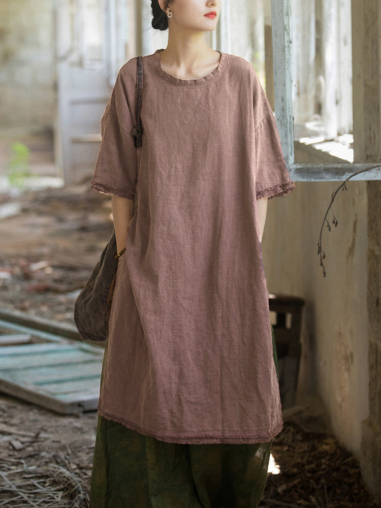 Women Vintage Solid Ramie Slant-Closure Long Shirt