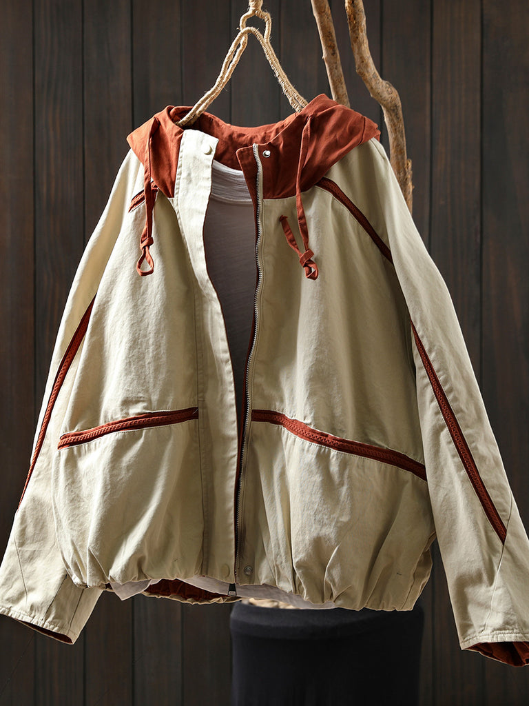 Women Autumn Colorblock Hooded Cotton Cardigan Coat