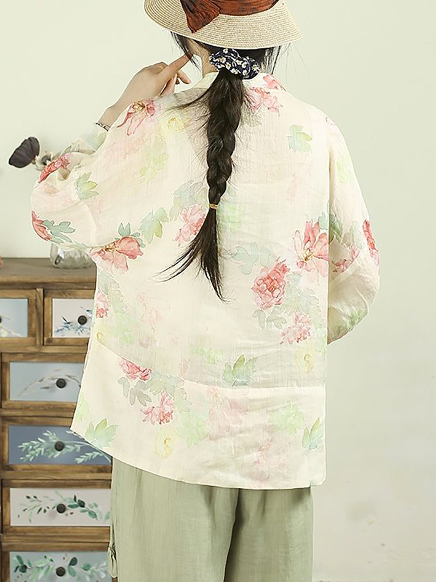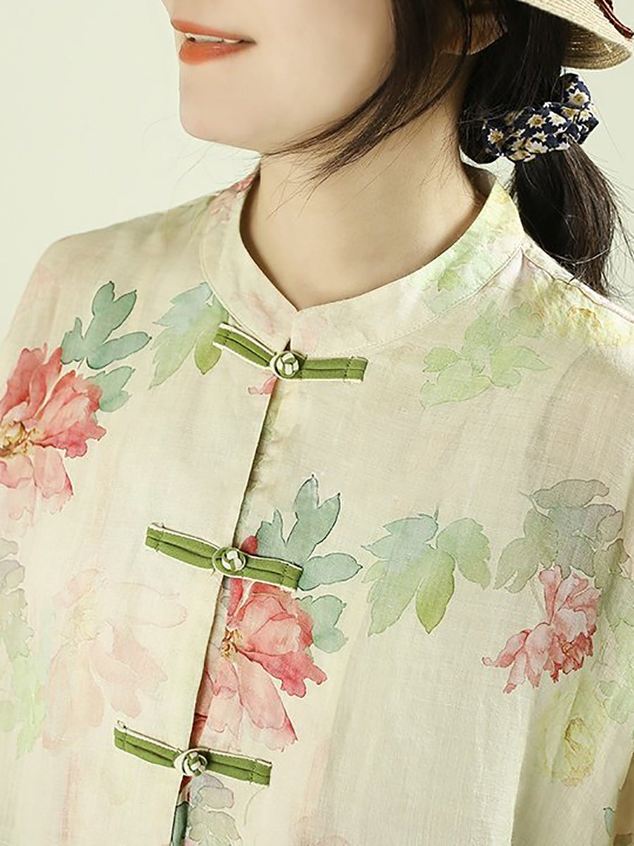 Women Ethnic Spring Flower Stand Collar 100%Ramie Shirt