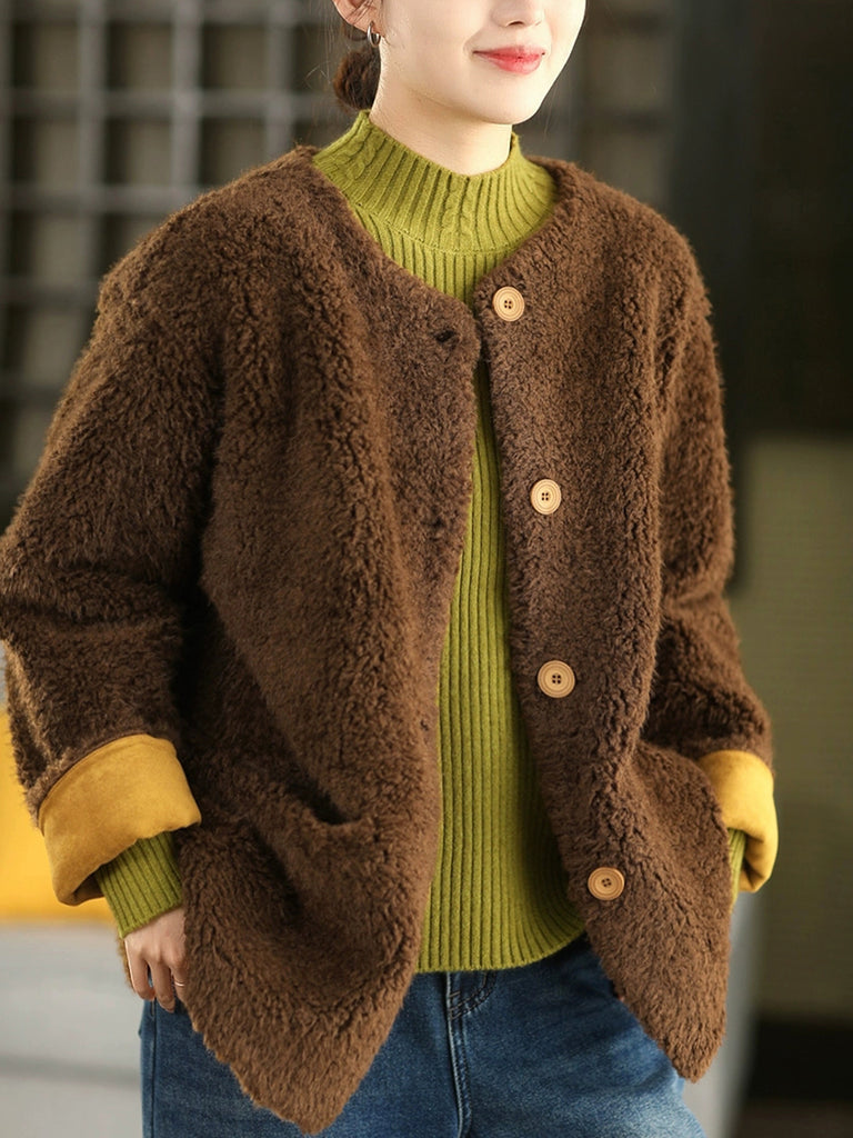 Women Winter Retro Pure Color Fleece O-Neck Coat