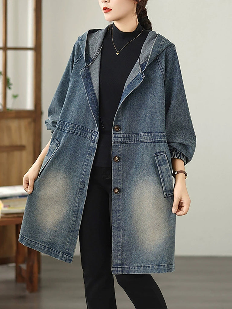 Women Vintage Autumn Denim Pure Color Loose Hooded Coat