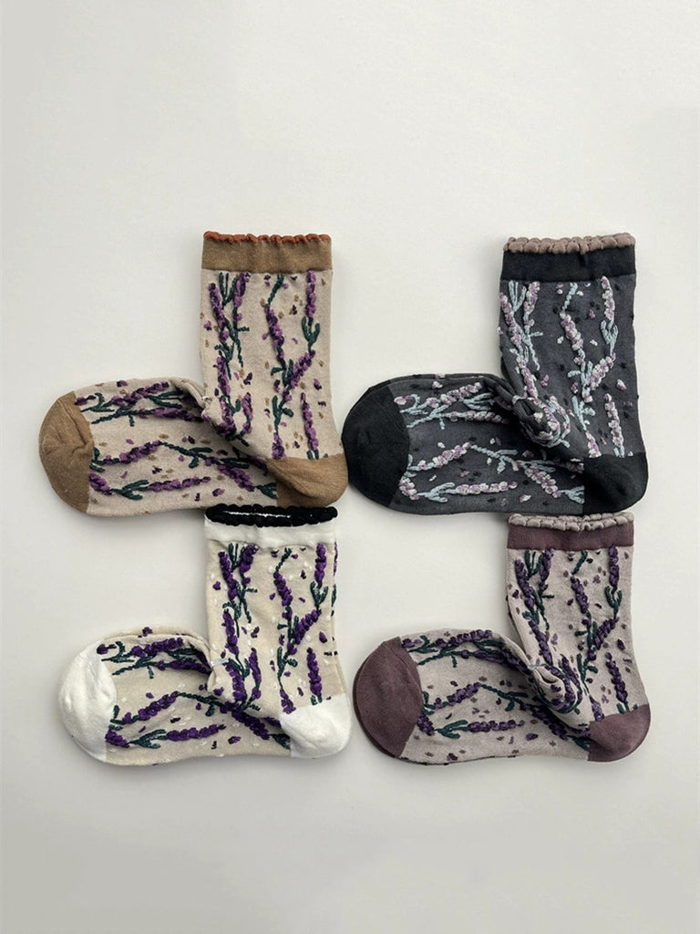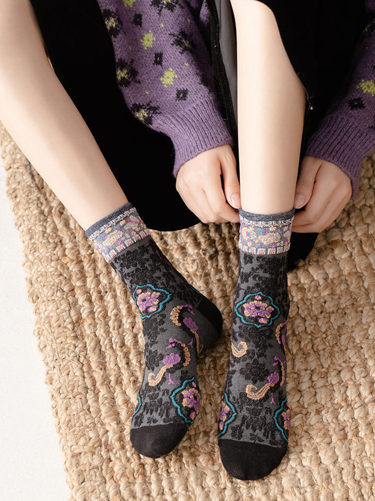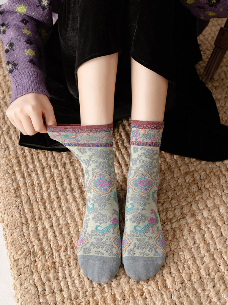 5 Pairs Women Vintage Flower Jacquard Cotton Socks