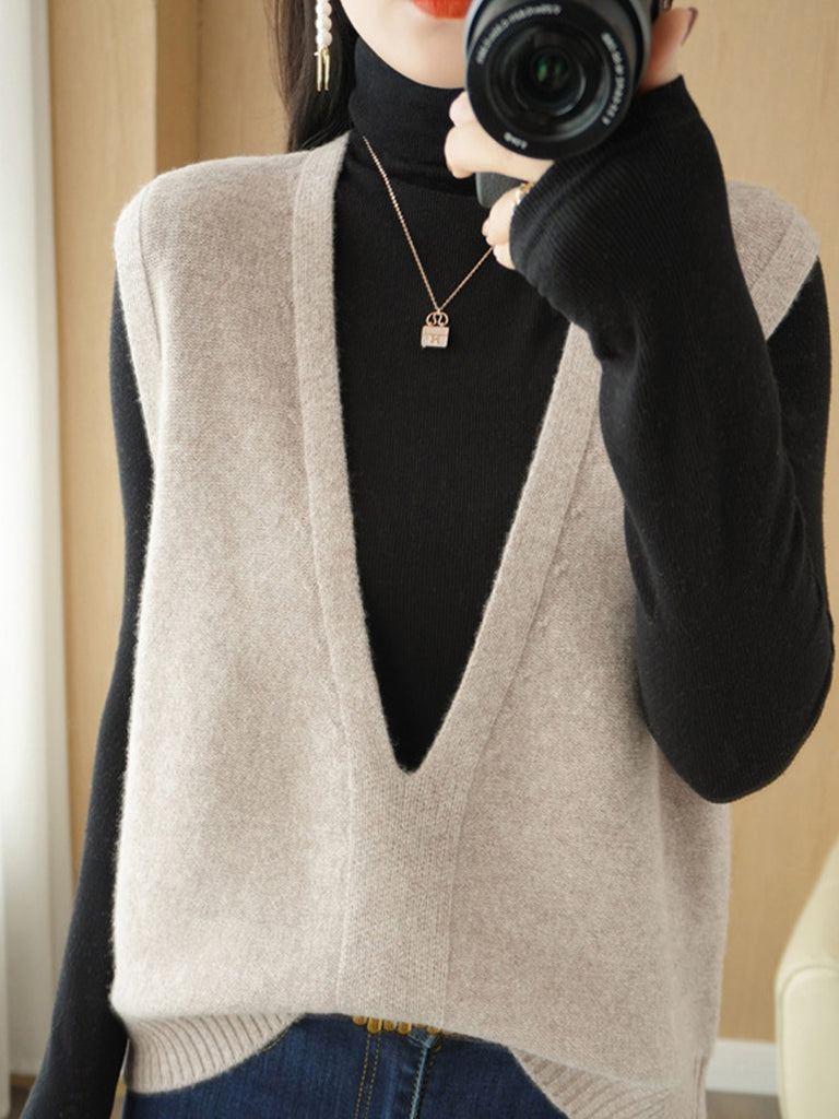 Women Autumn Irregular Spliced V-Neck Knitted Vest