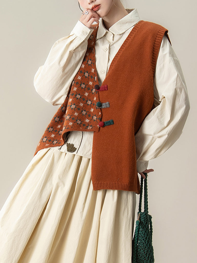 Women Autumn Artsy Patchwork V-Neck Knitted Vest