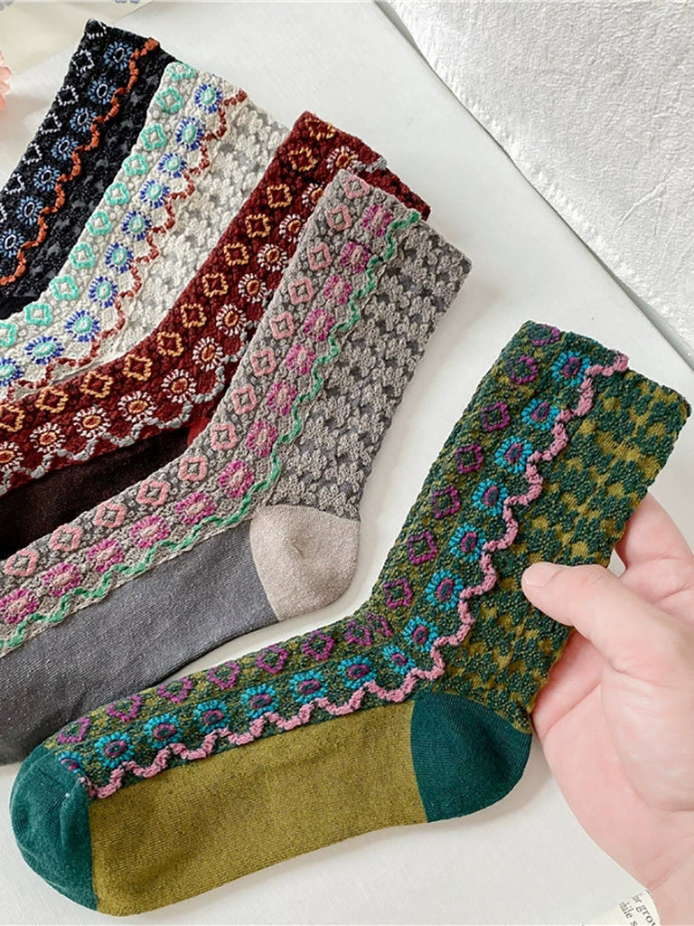 5 Pairs Women Autumn Flower Jacquard Mid Heel Socks