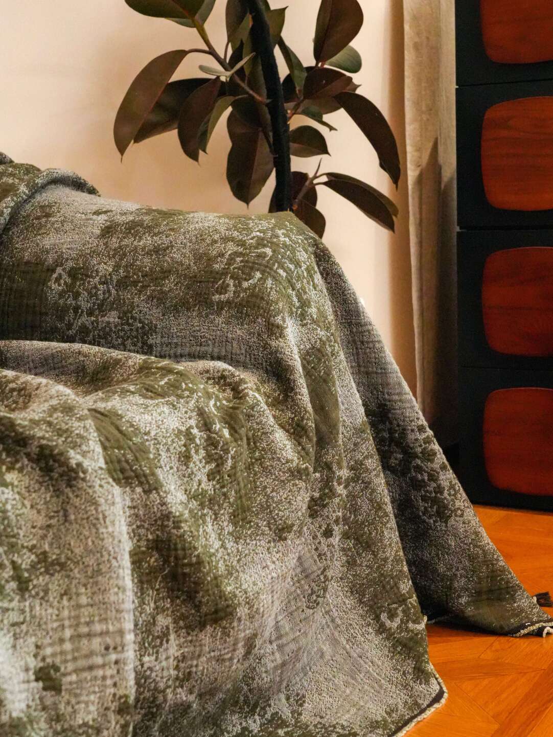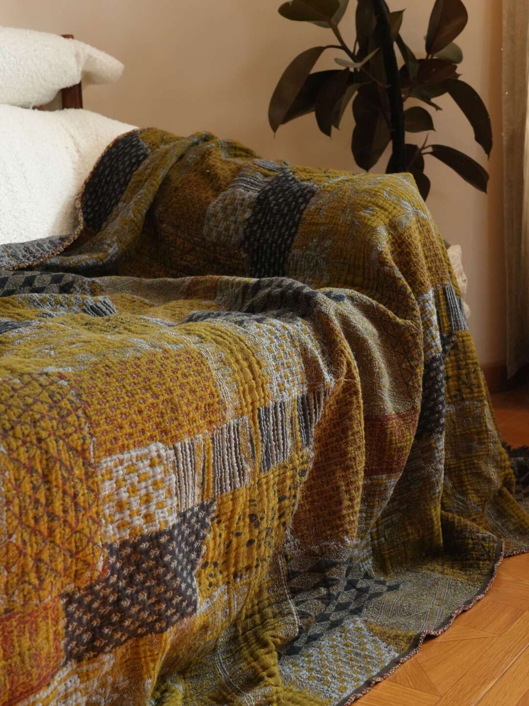 Retro Beige Floral Patchwork Cotton-Linen Sofa Blanket