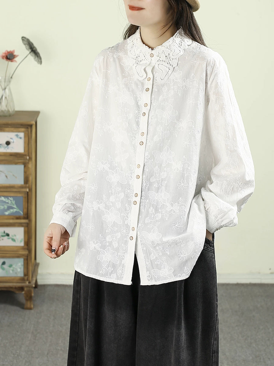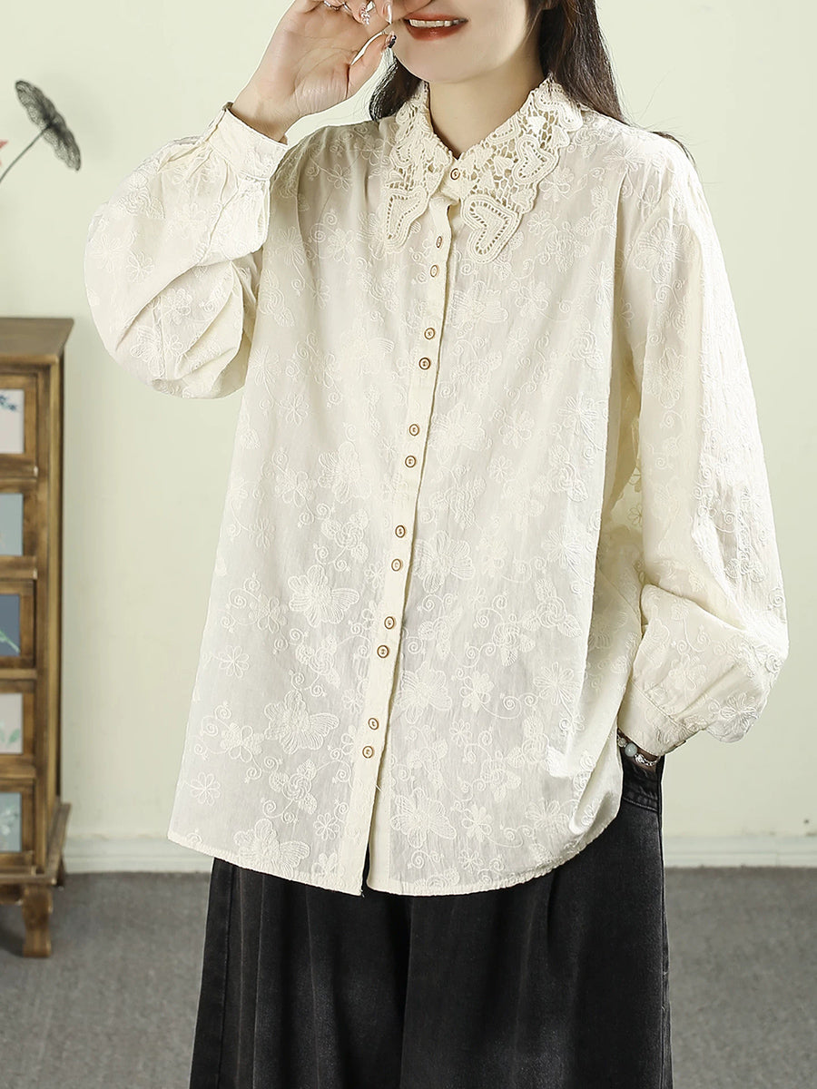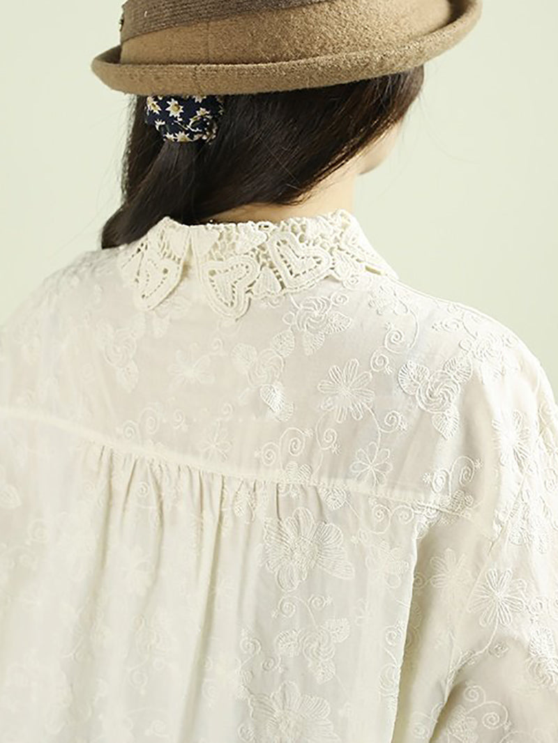 Women Artsy Spring Embroidery Lace 100%Cotton Shirt