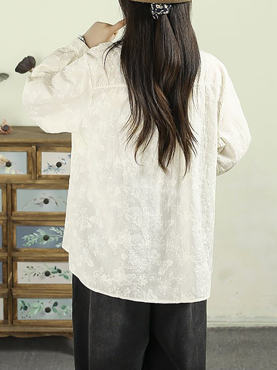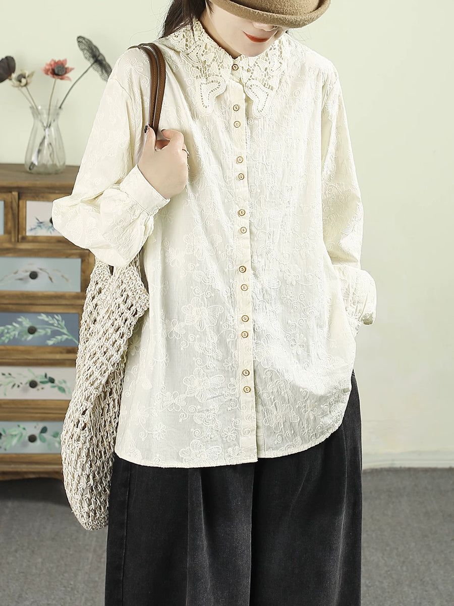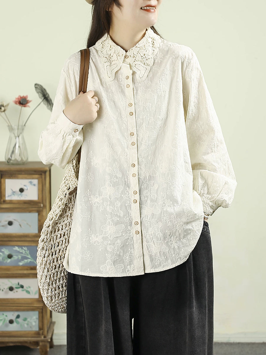 Women Artsy Spring Embroidery Lace 100%Cotton Shirt