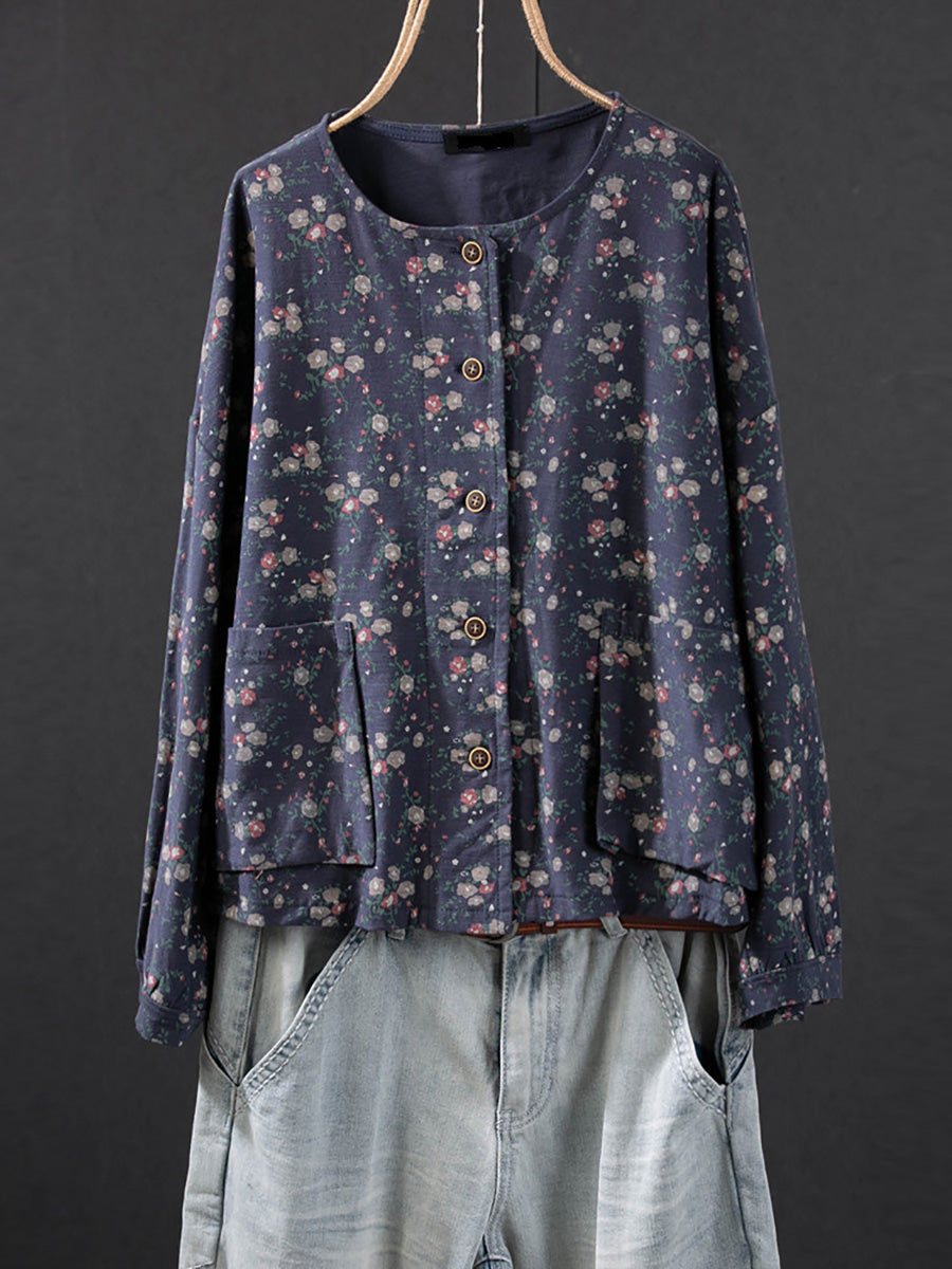Women Artsy Spring Floral Cotton O-Neck Shirt