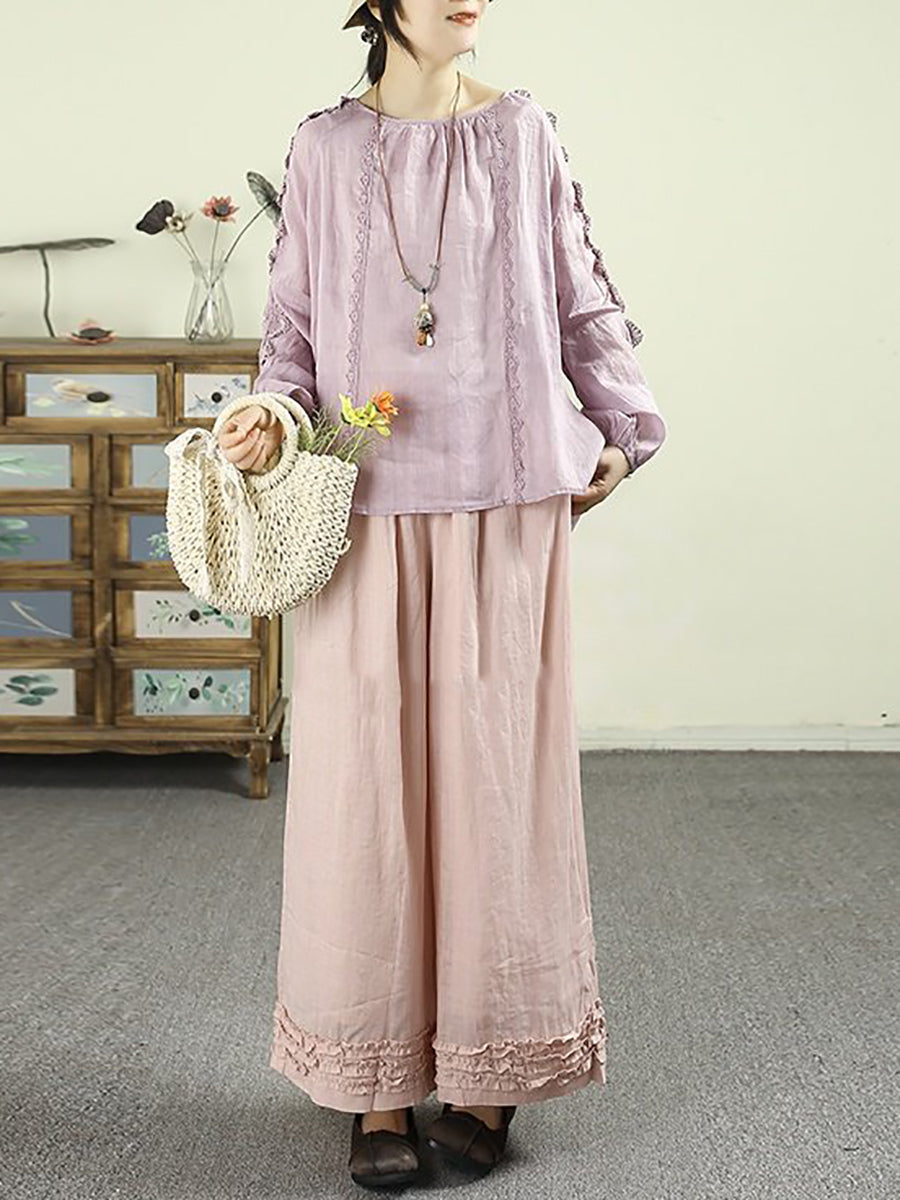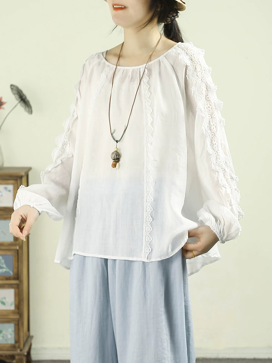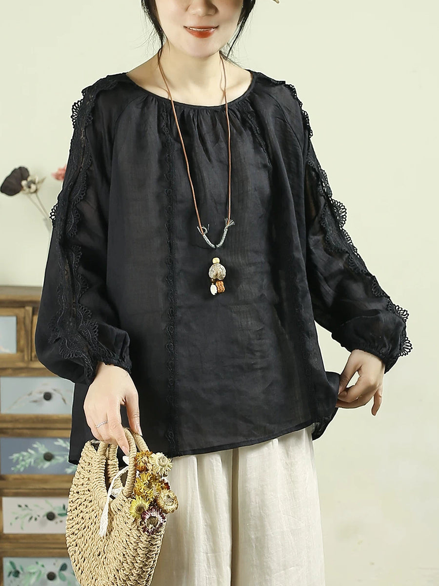 Women Artsy Spring Lace Spliced O-Neck 100%Ramie Shirt