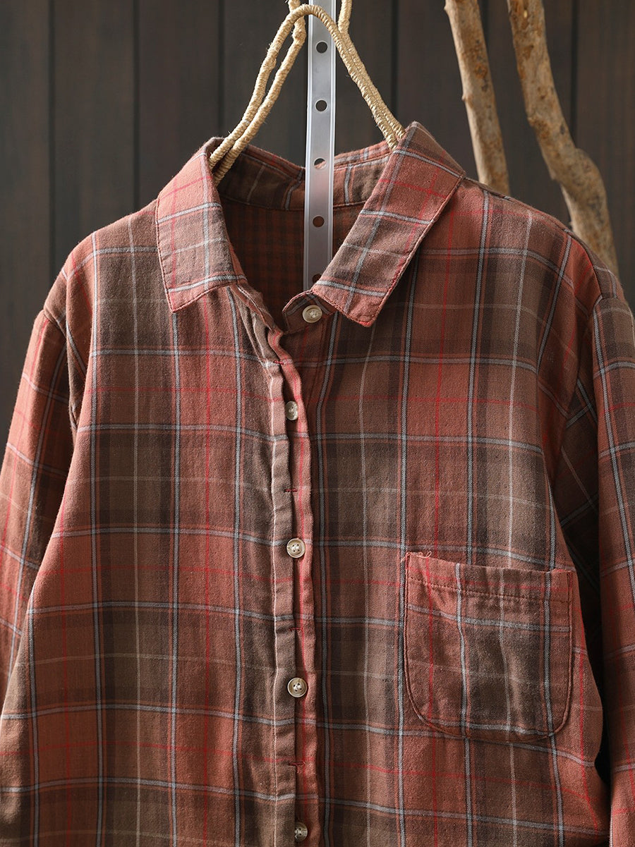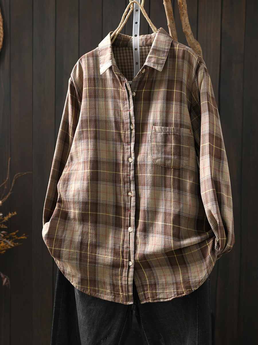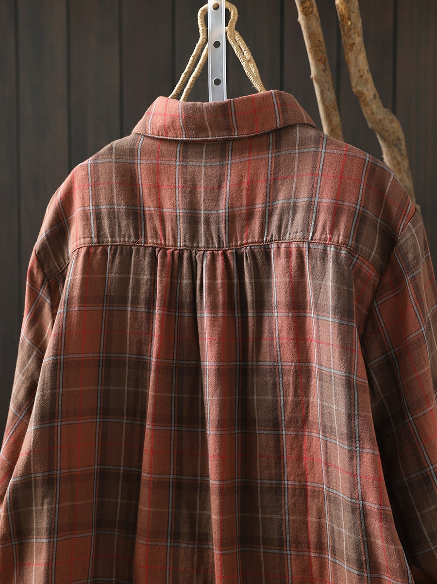 Women Artsy Spring Plaid Turn-down Collar 100%Cotton Shirt