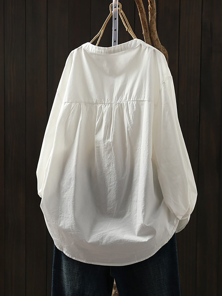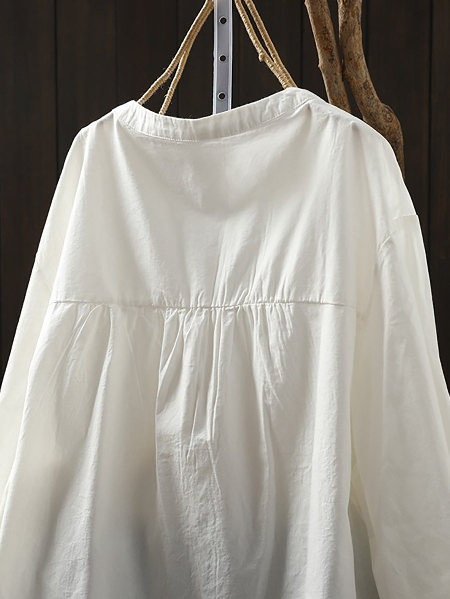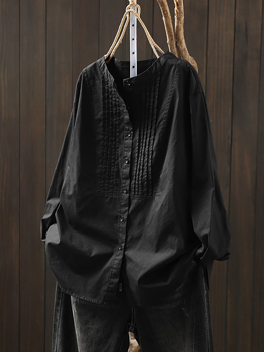 Women Artsy Spring Shirred Stand Collar 100%Cotton Shirt