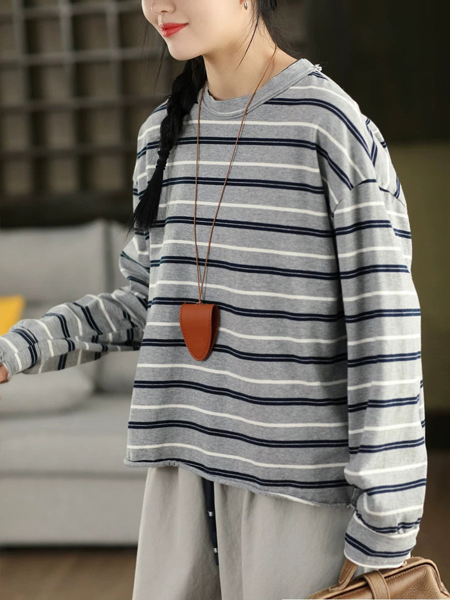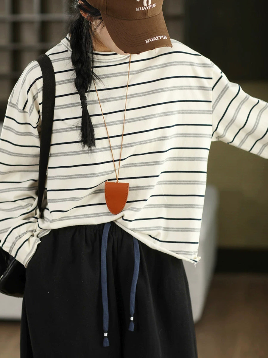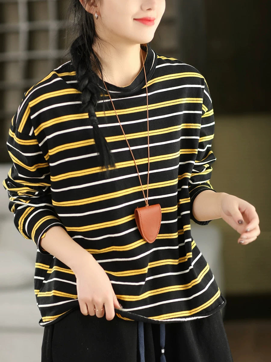 Women Artsy Spring Stripe Cotton O-Neck Blouse