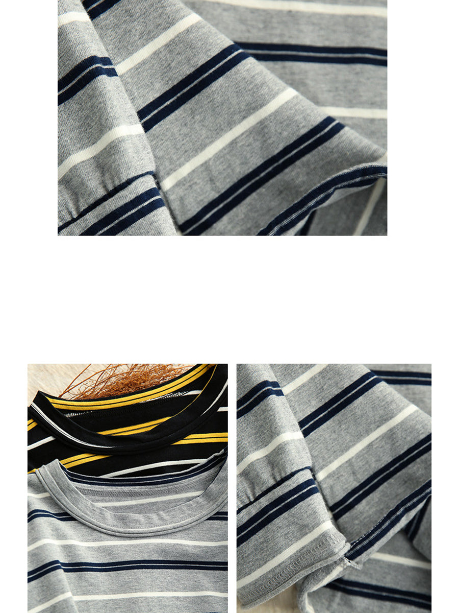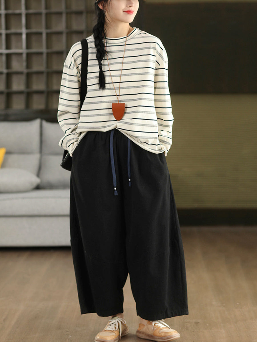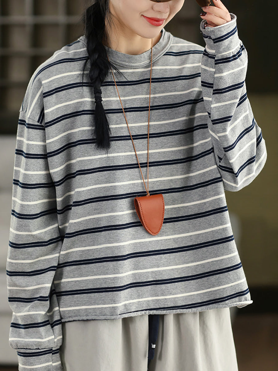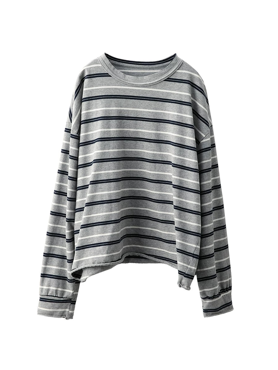 Women Artsy Spring Stripe Cotton O-Neck Blouse