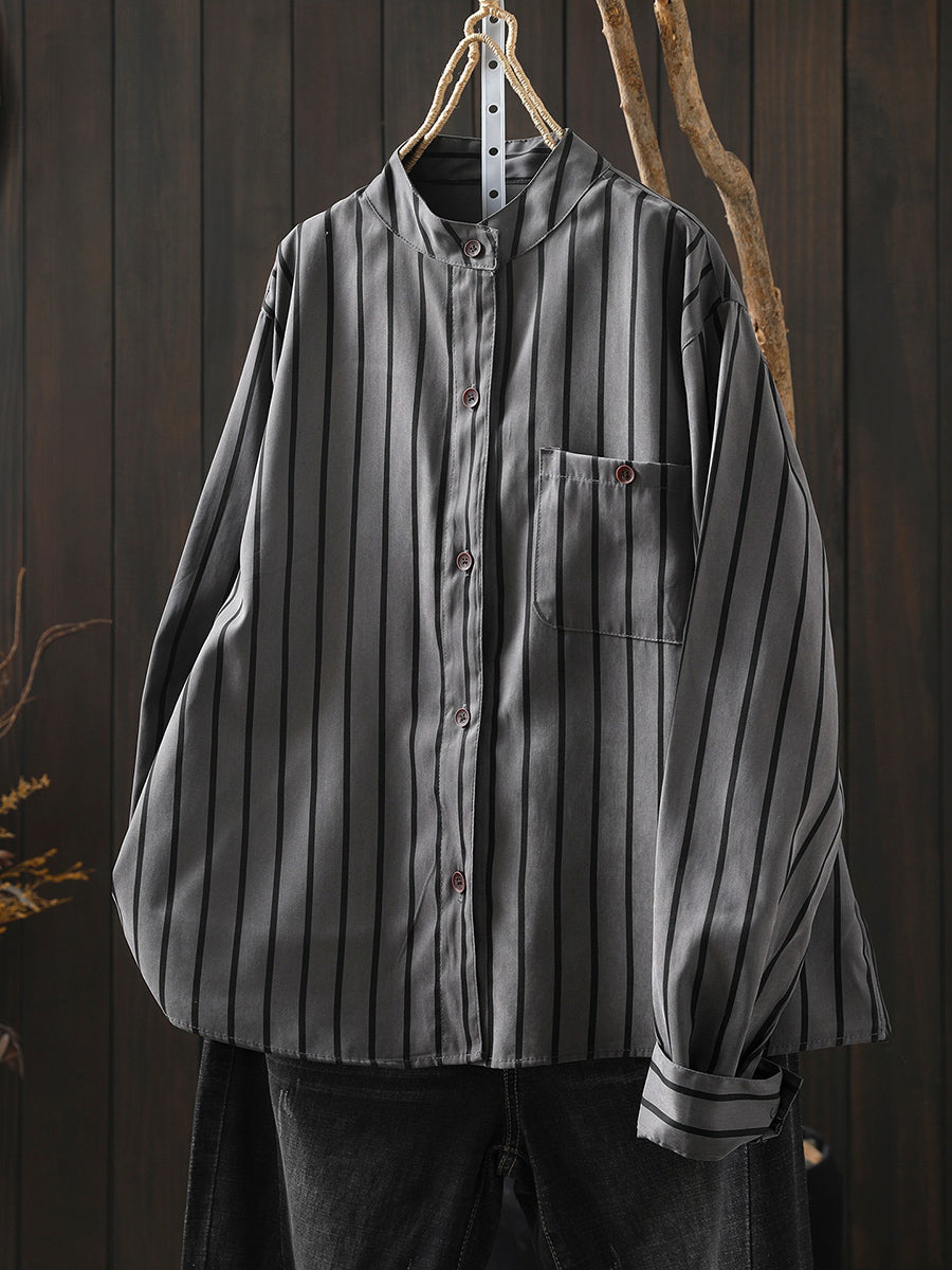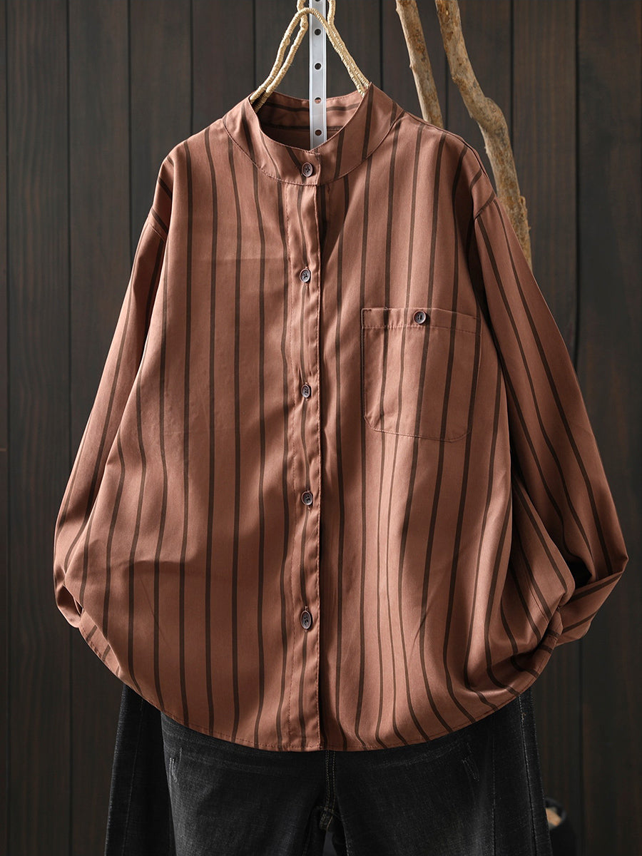Women Artsy Spring Stripe Stand Collar Cotton Shirt