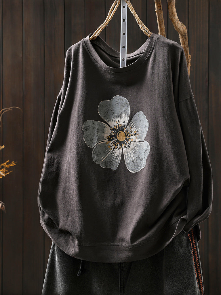 Plus Size Women Autumn Artsy Flower O-Neck Cotton Blouse