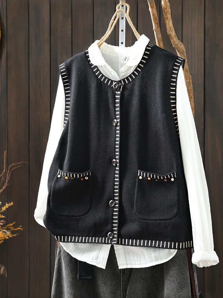 This knitted vest combines functionality with timeless design through its thoughtfully balanced fiber composition of 55% cotton and 45% acrylic. The round neckline and retro-inspired silhouette offer sophisticated styling options for layering during autumn and winter months. The knit structure provides optimal temperature regulation and flexibility, making it a reliable wardrobe staple across seasonal transitions.