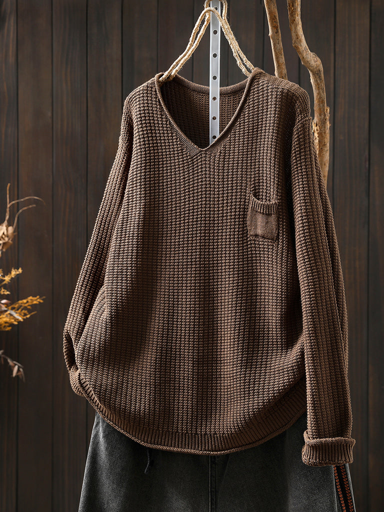 Women Autumn Artsy Pure Color Knitted V-Neck Sweater