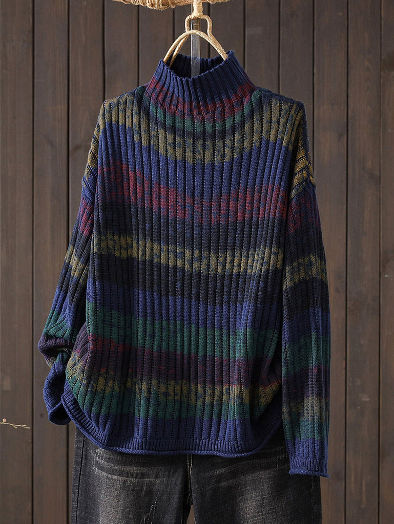 Women Autumn Colorblock Stripe Half-Turtleneck Sweater