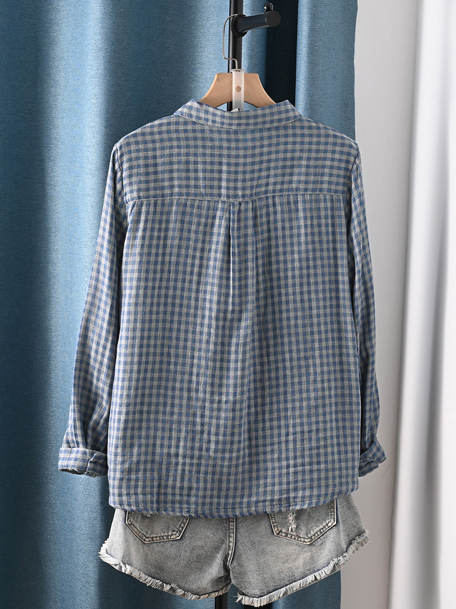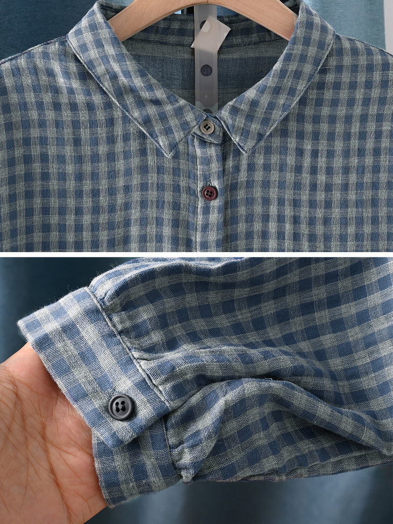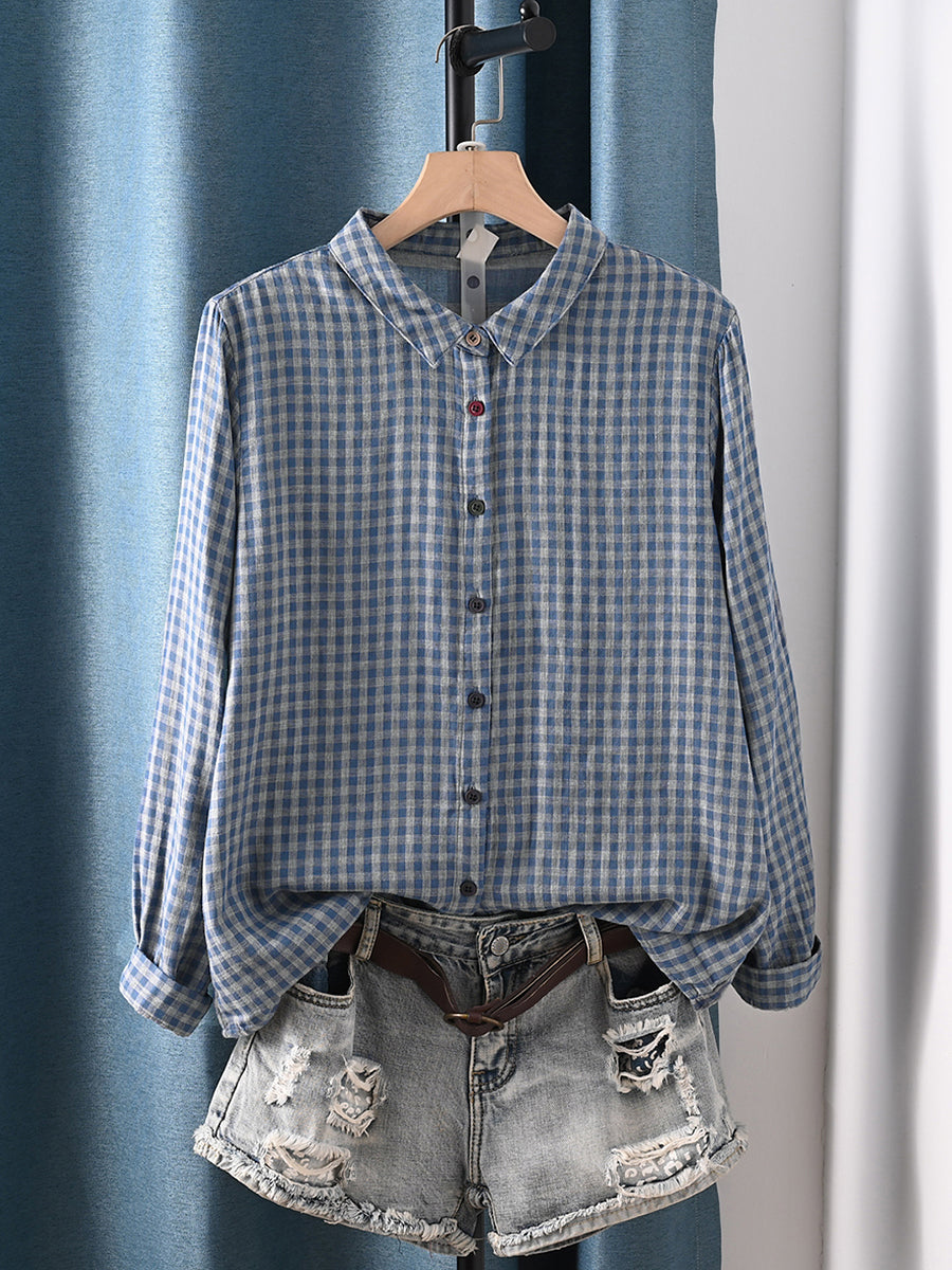 Women Autumn Plaid Turn-down Collar 100%Cotton Shirt