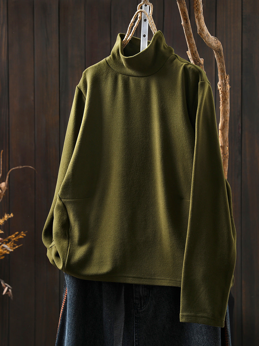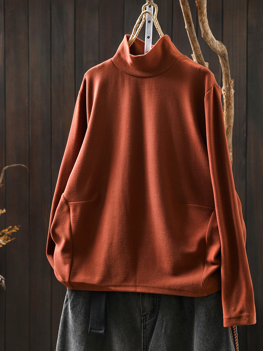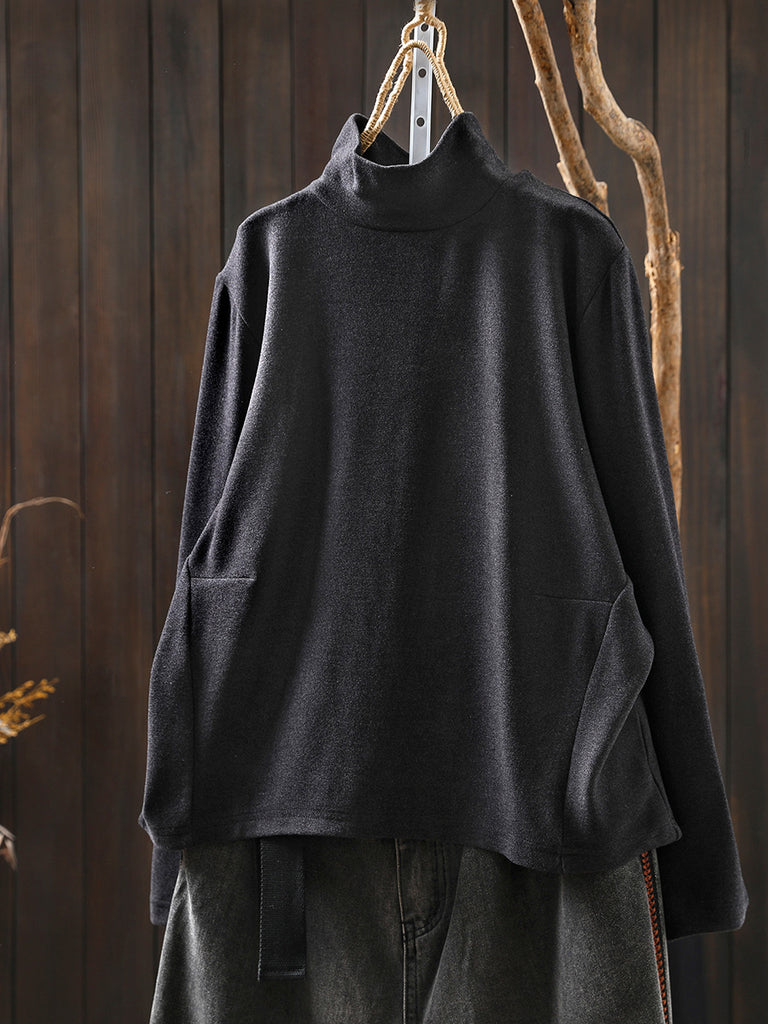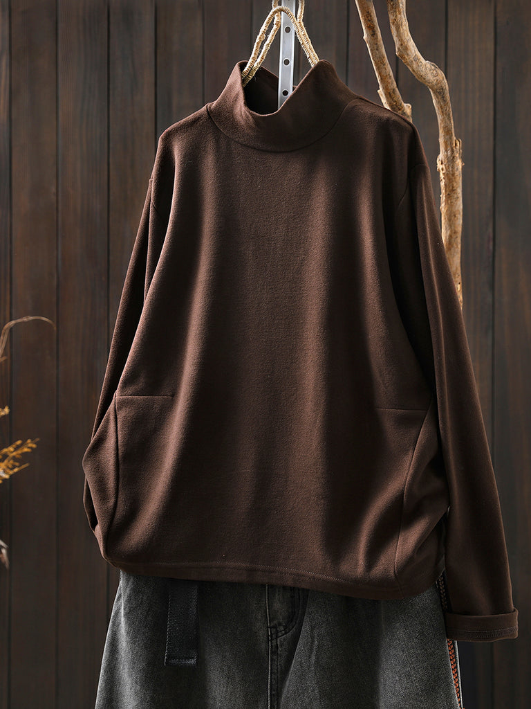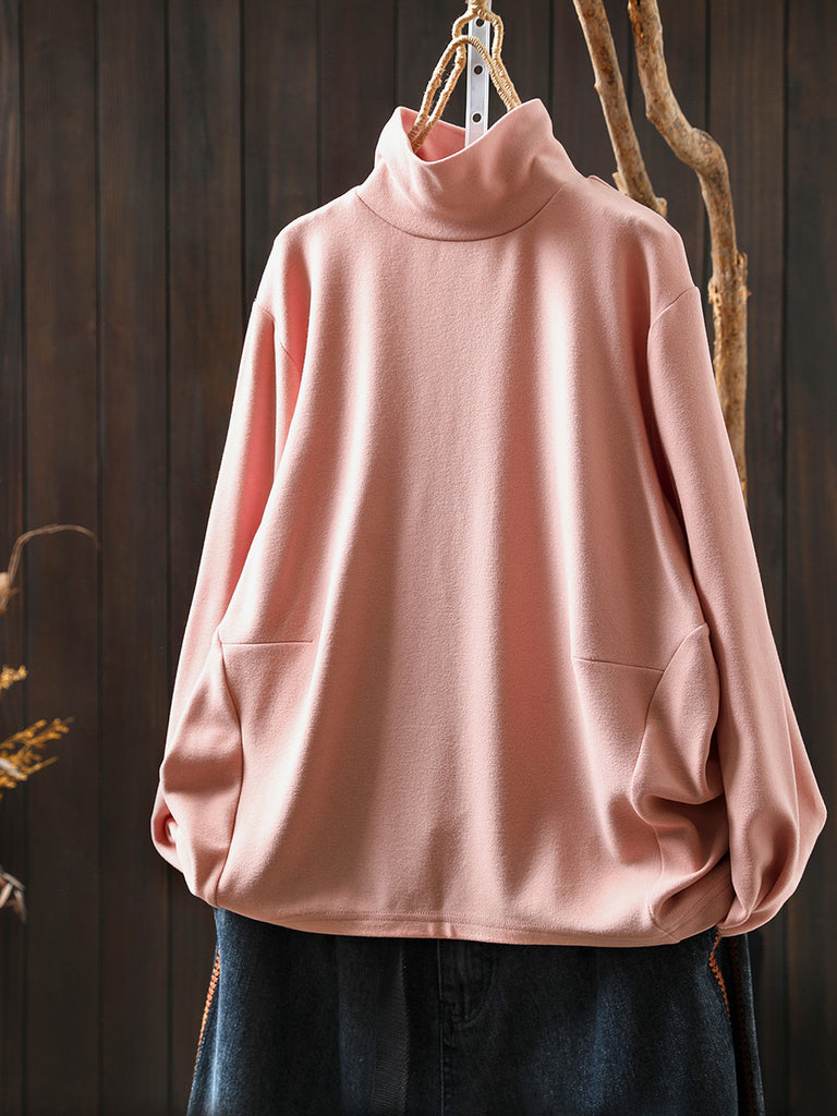 Women Casual Autumn Pure Color Turtleneck Cotton Blouse