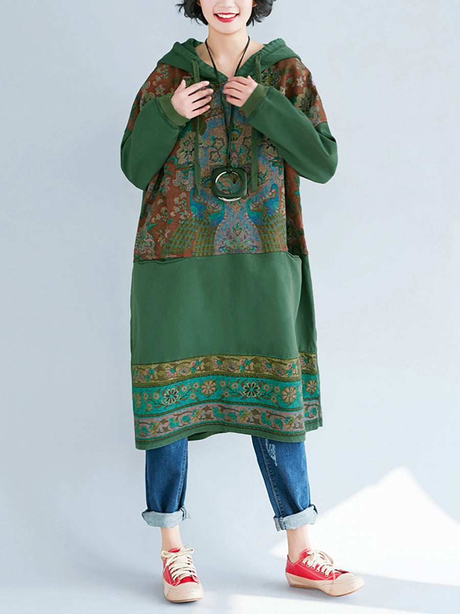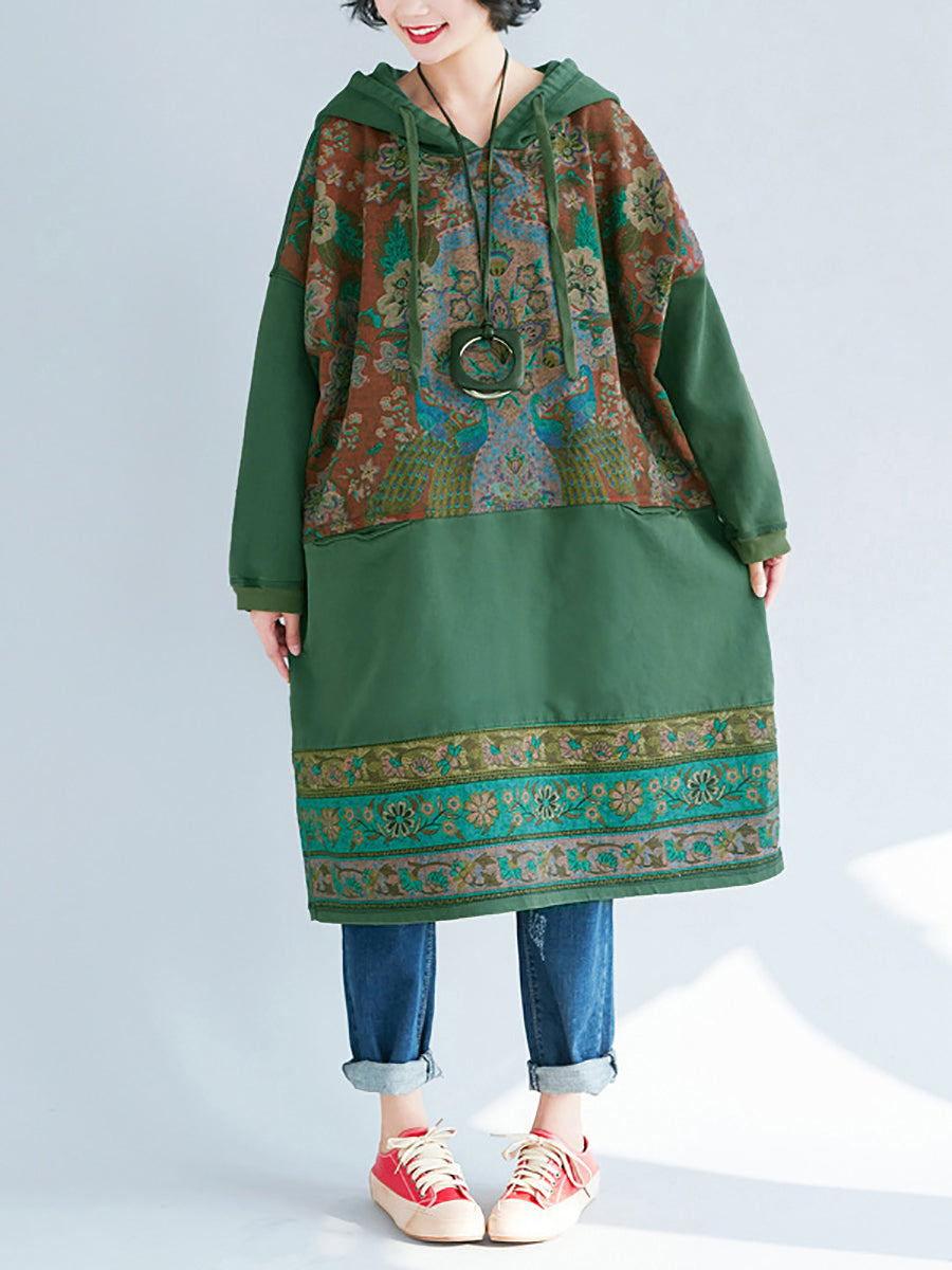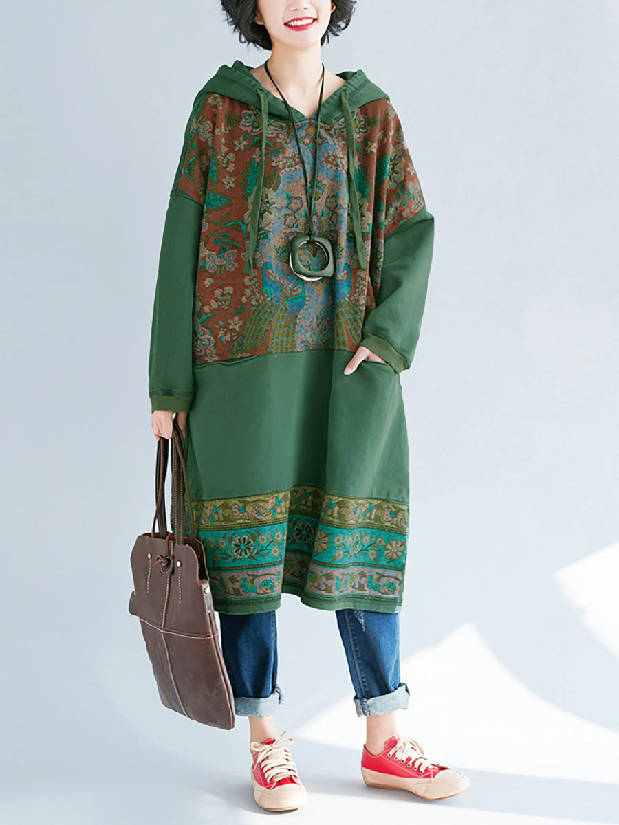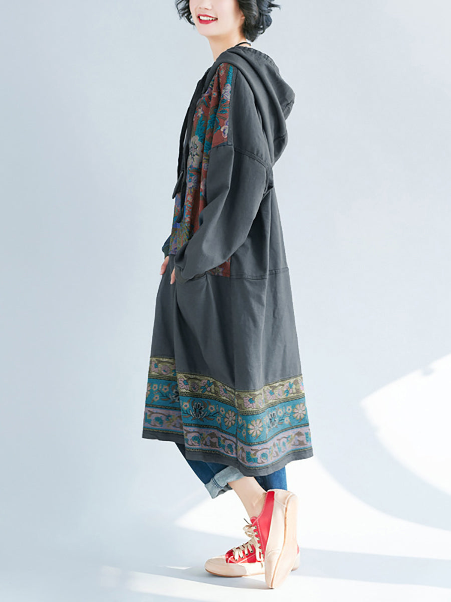 Women Ethnic Flower Spliced Long Pocket Hooded Dress