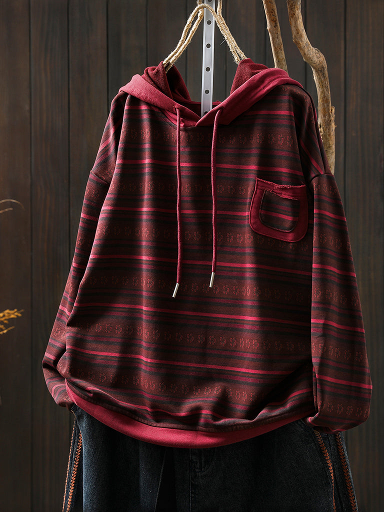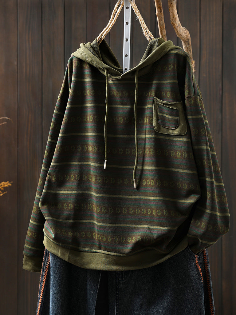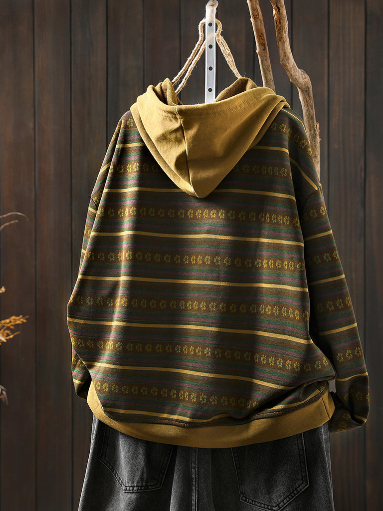 Women Retro Autumn Stripe 100%Cotton Hoodie