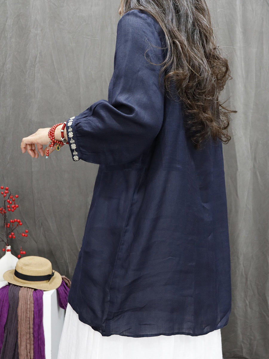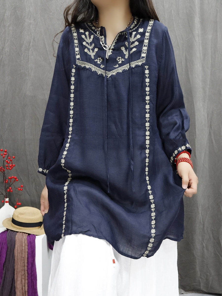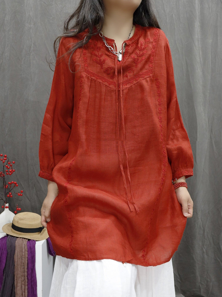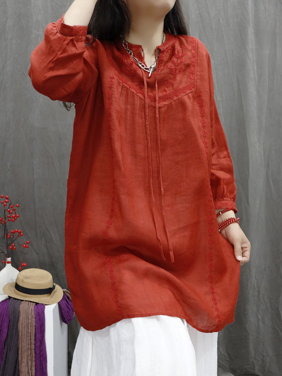Women Spring Artsy Embroidery 100%Ramie V-Neck Blouse