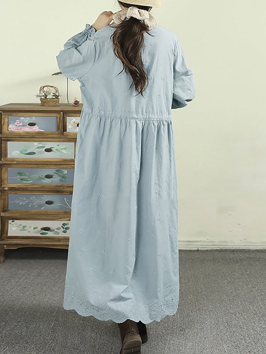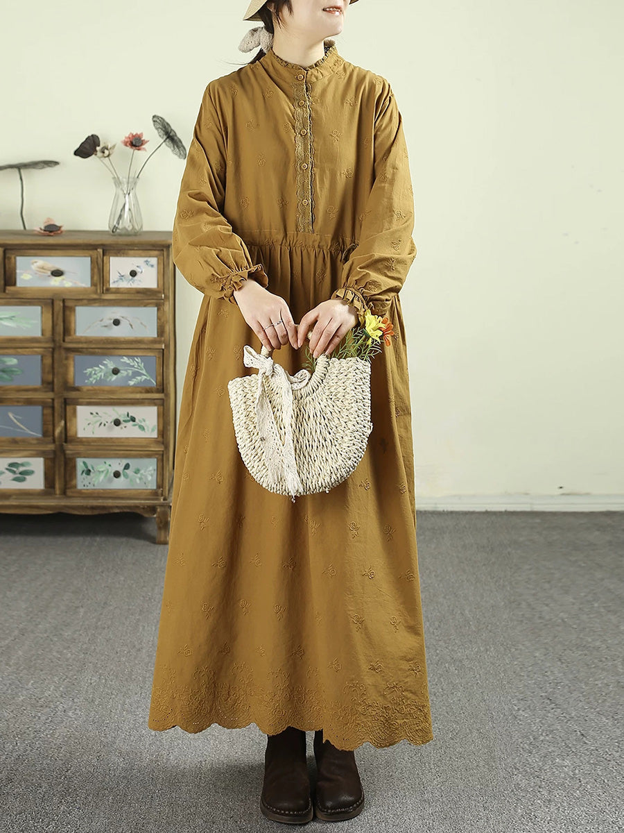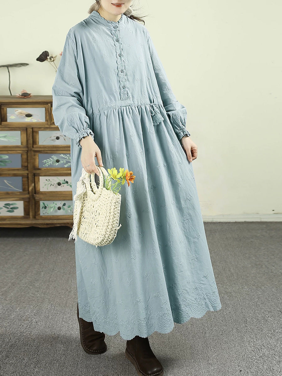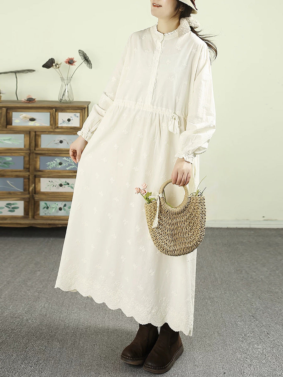 Women Spring Artsy Embroidery Stand Collar 100%Cotton Dress