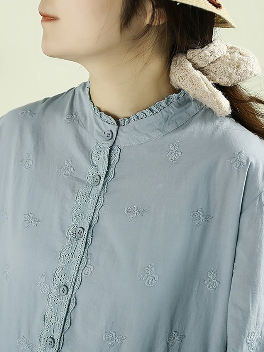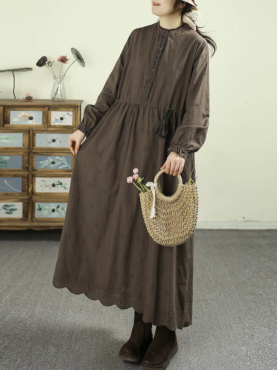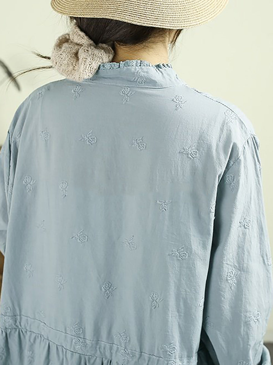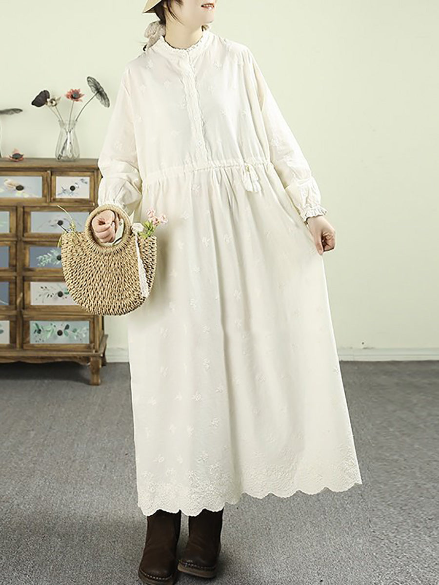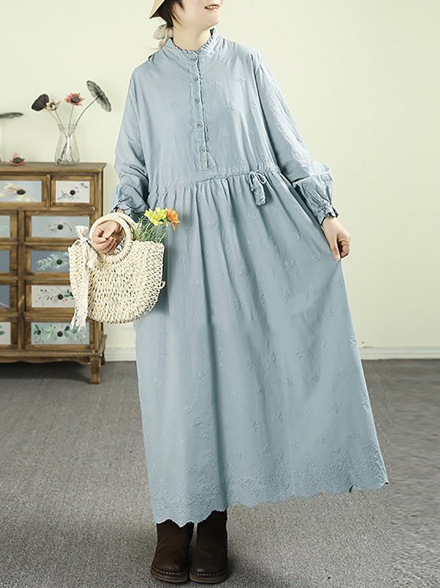 Women Spring Artsy Embroidery Stand Collar 100%Cotton Dress