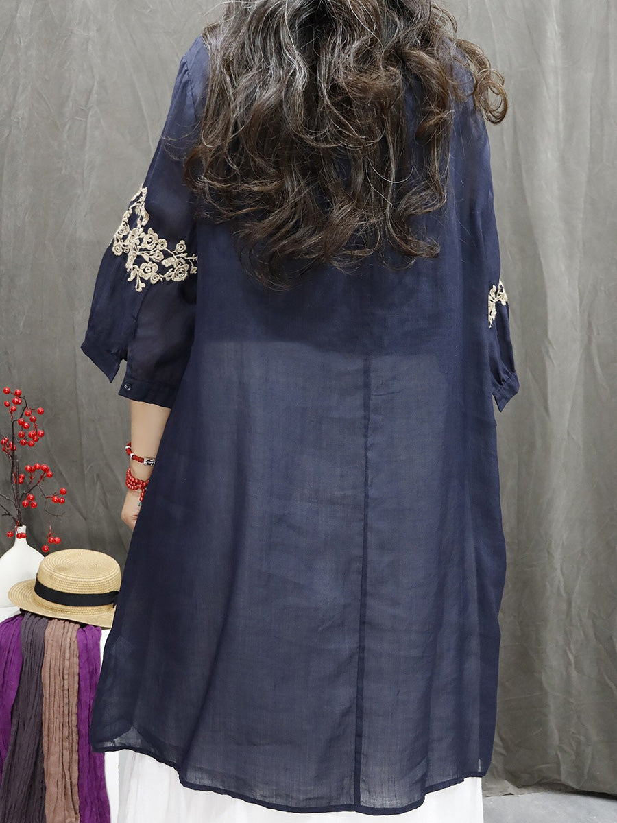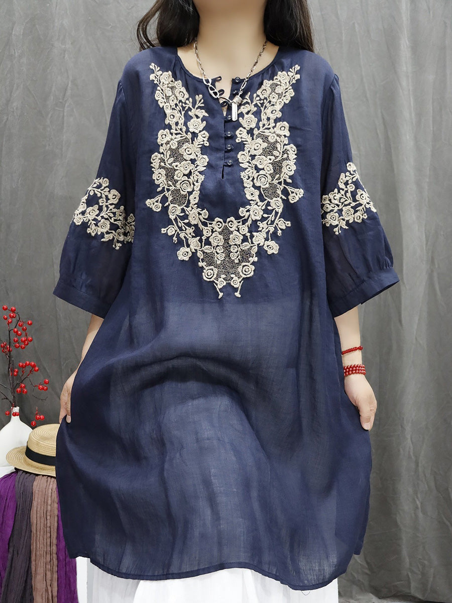 Women Spring Artsy Flower Embroidery 100%Ramie V-Neck Shirt