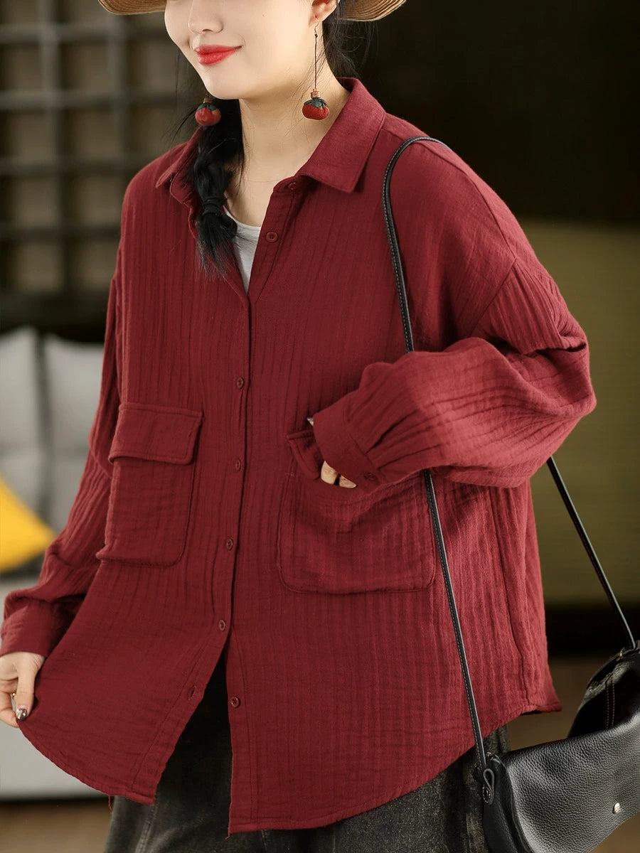 Women Spring Artsy Pure Color 100%Cotton Shirt