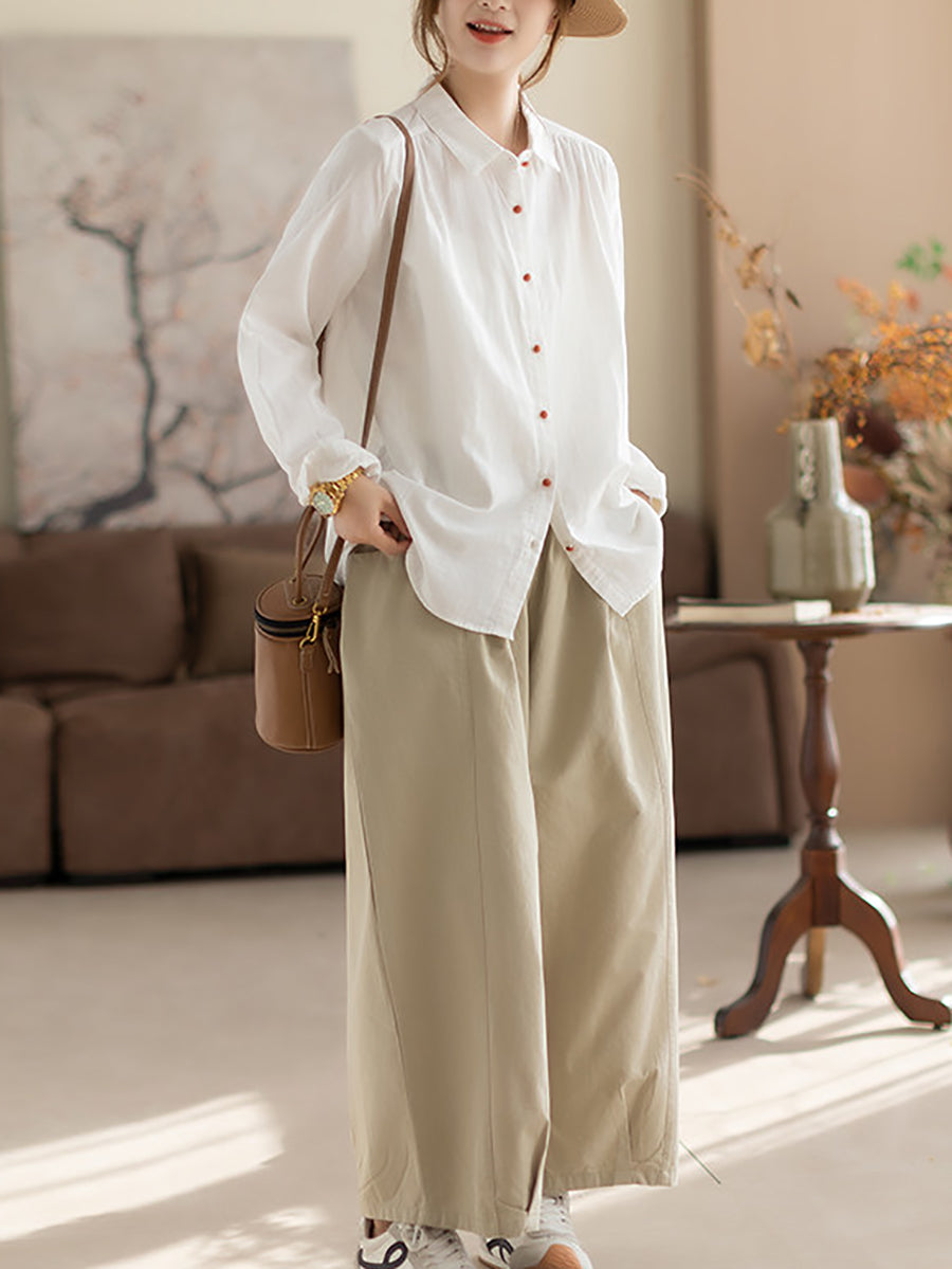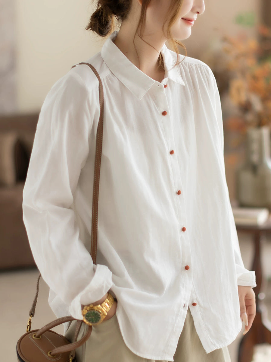 Women Spring Artsy Pure Color 100%Cotton Turn-down Collar Shirt