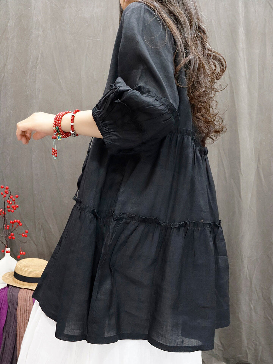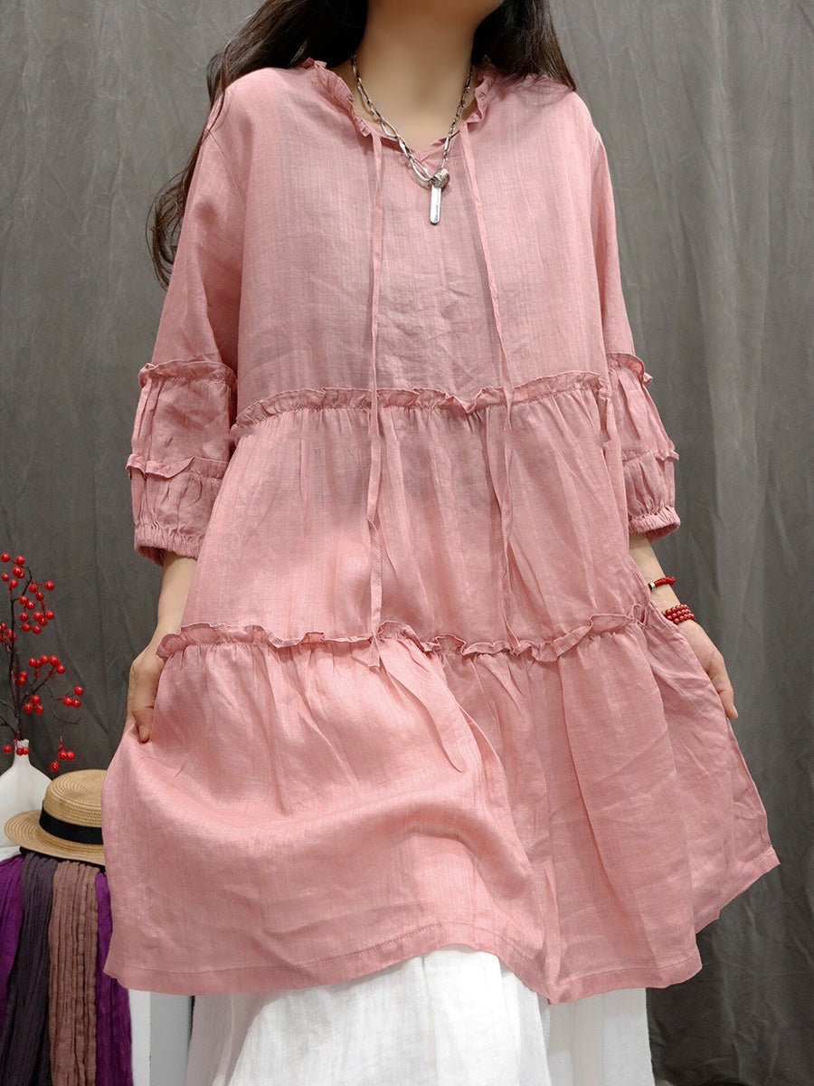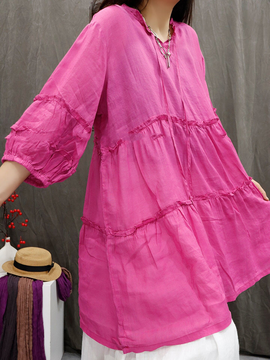 Women Spring Artsy Pure Color 100%Ramie V-Neck Blouse