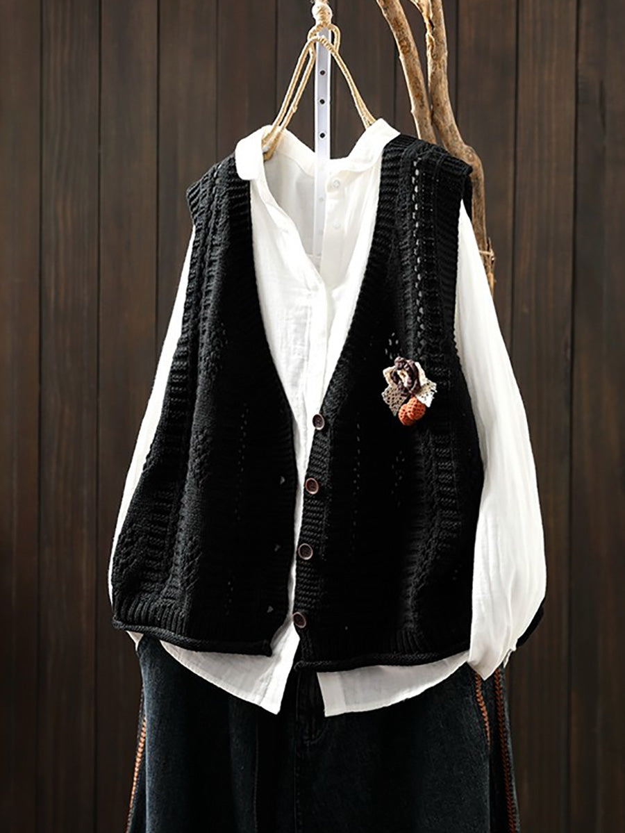 Crafted from a thoughtfully balanced blend of 45% cotton and 55% acrylic, this knitted vest delivers both comfort and durability. The distinctive V-neck silhouette pairs with an artsy aesthetic, making it an ideal layering piece for transitional seasons. Perfect for spring and autumn wear, this versatile garment bridges casual and refined styling with understated sophistication.