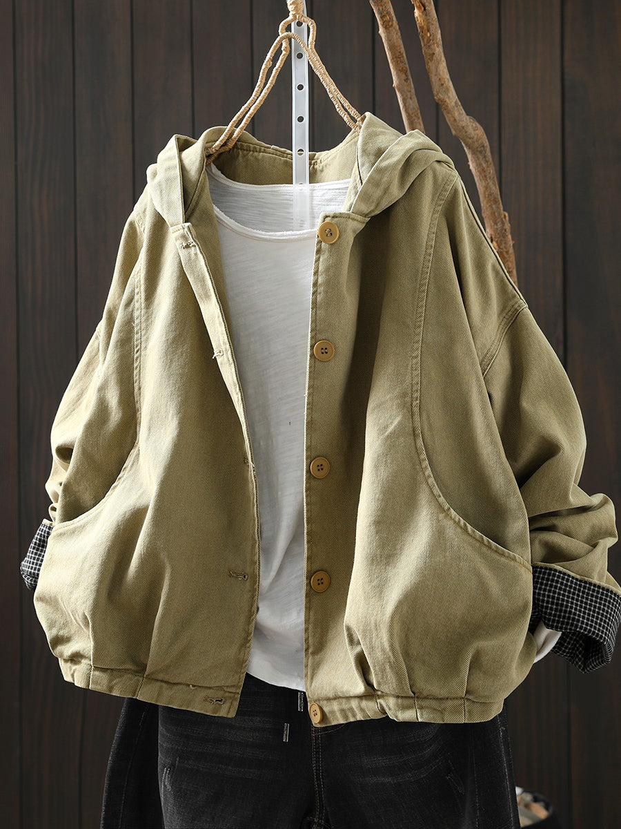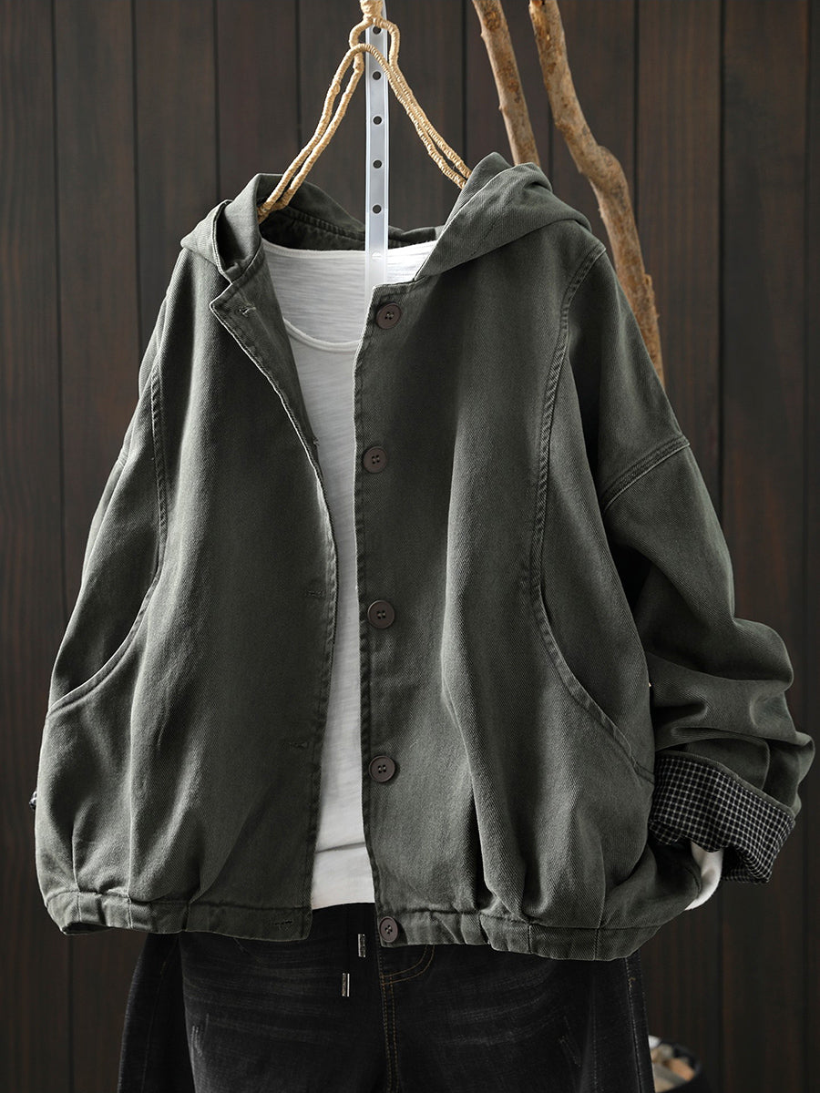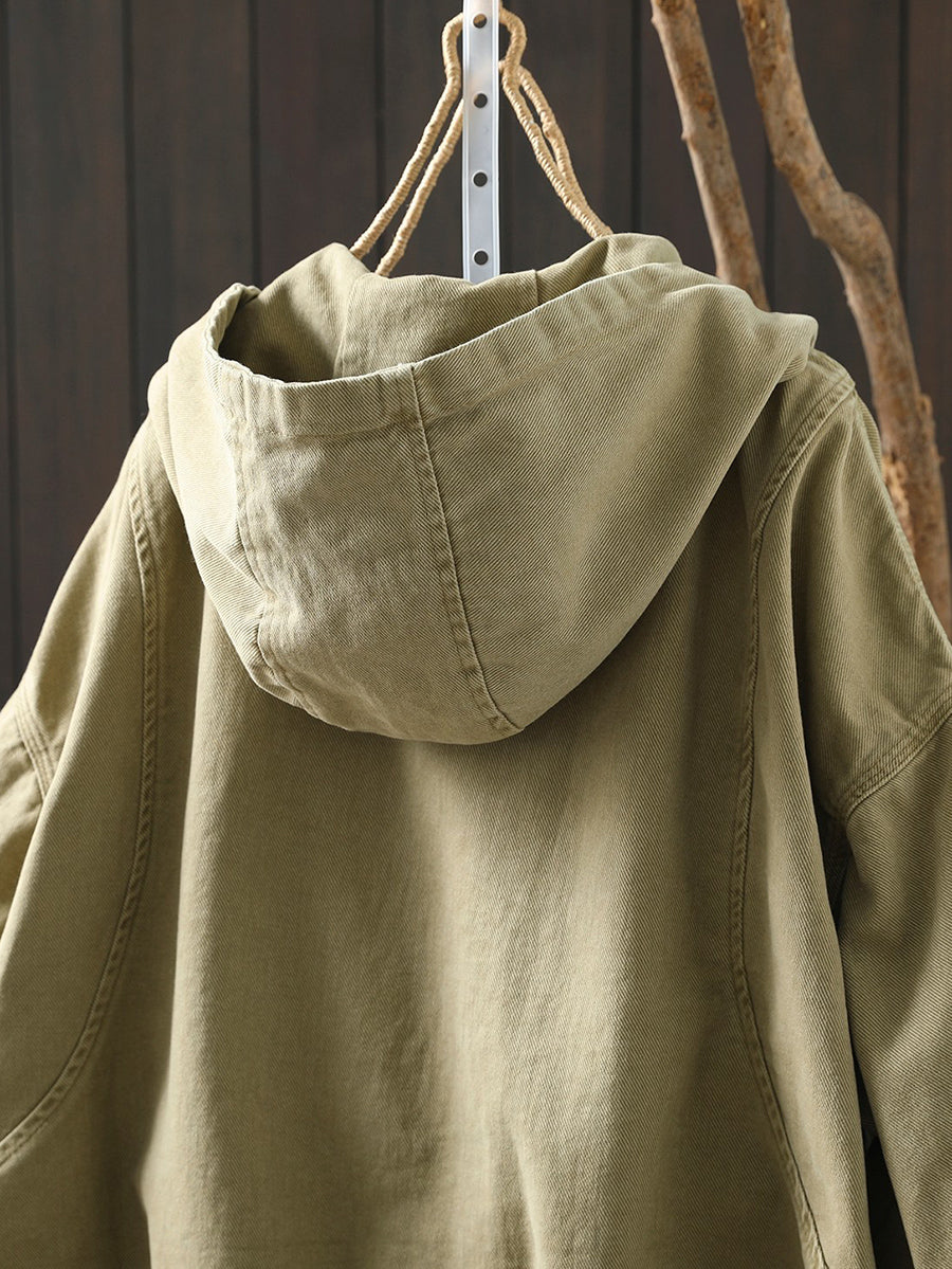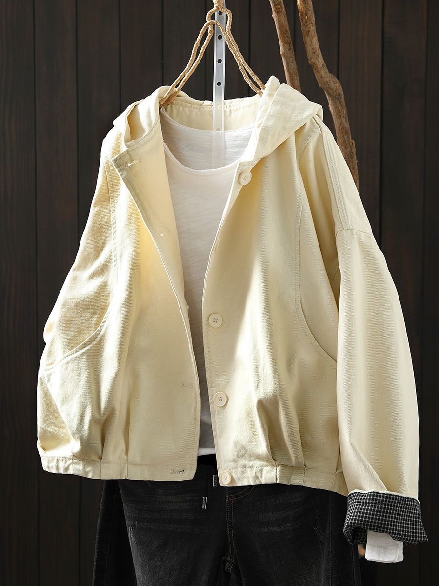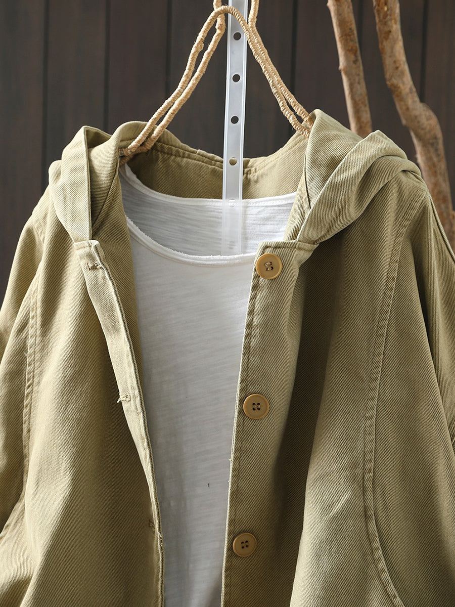 Women Spring Casual Pure Color Hooded Cotton Coat