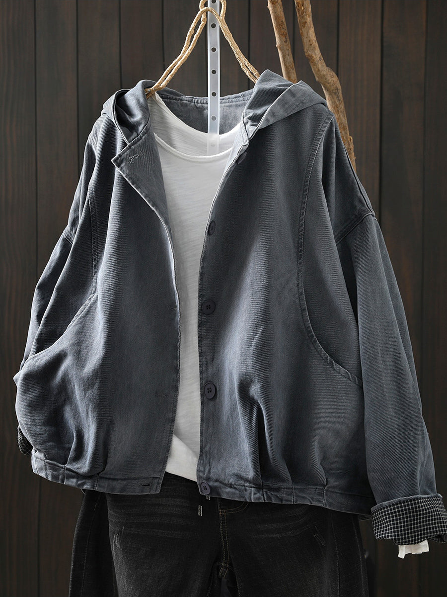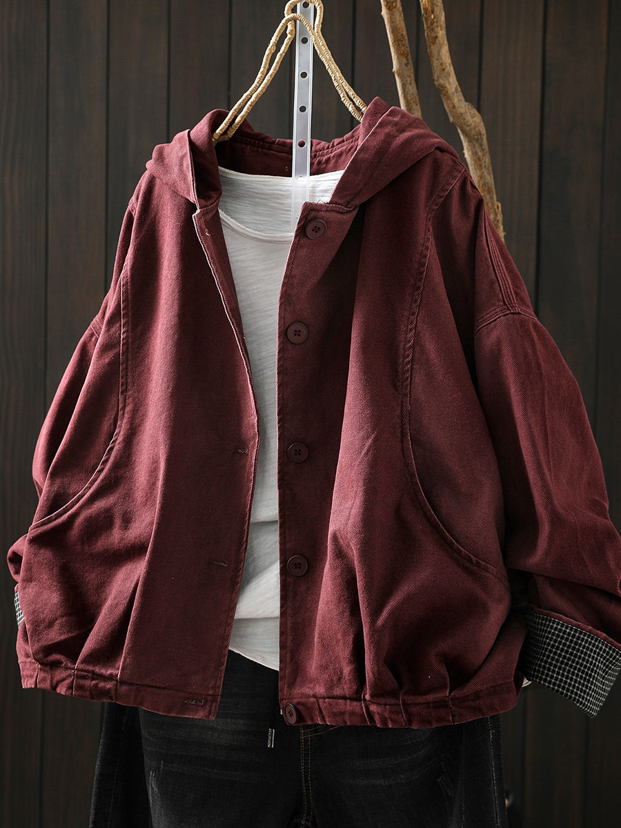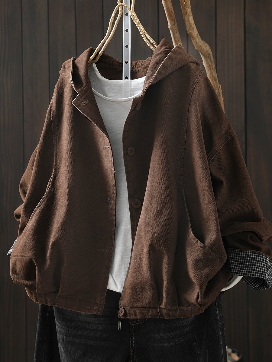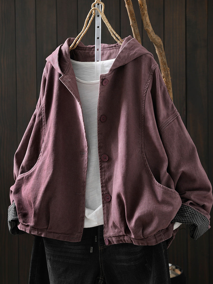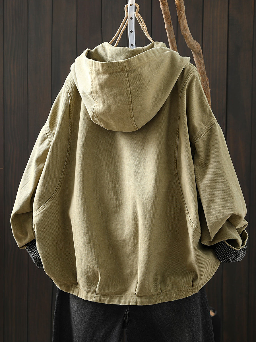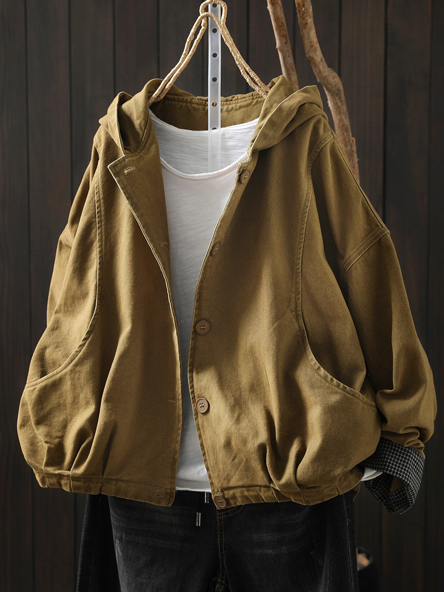 Women Spring Casual Pure Color Hooded Cotton Coat