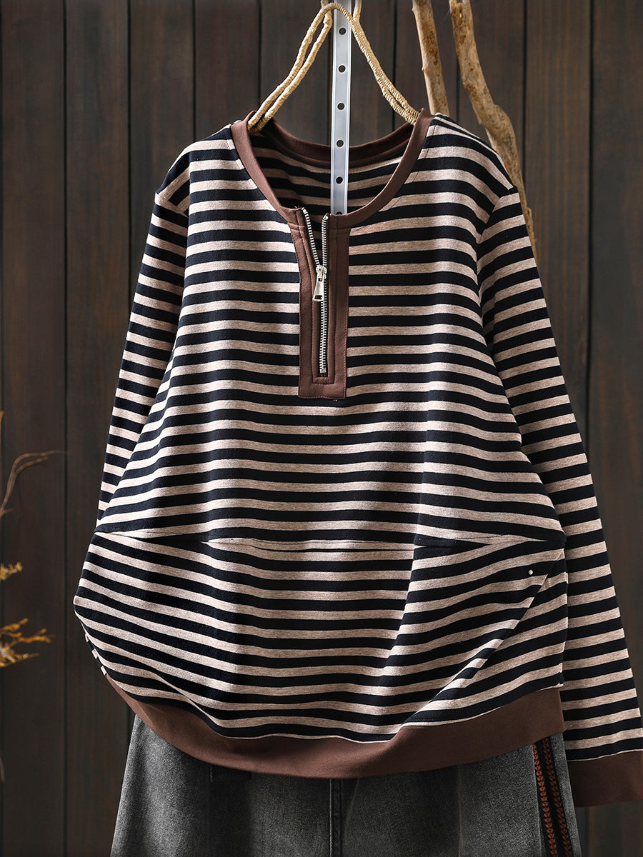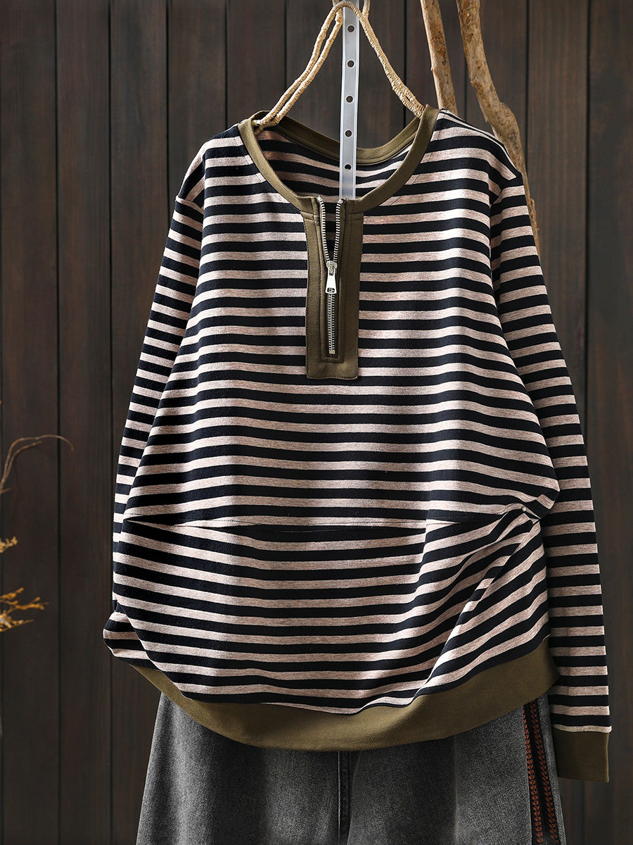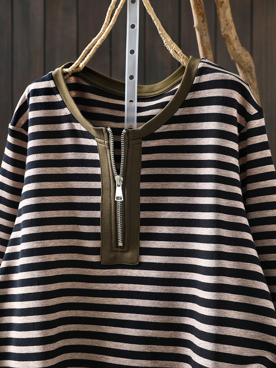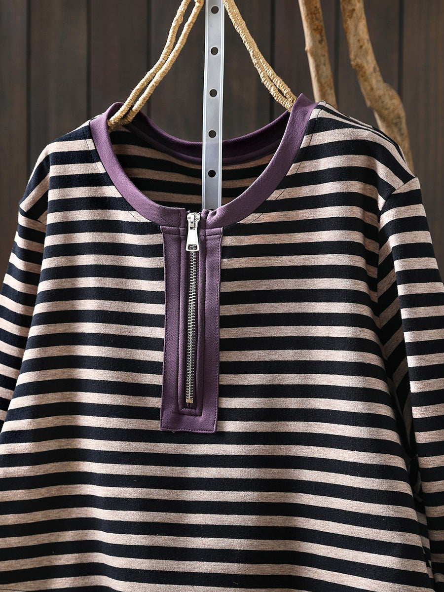 Women Spring Casual Stripe Cotton O-Neck Blouse