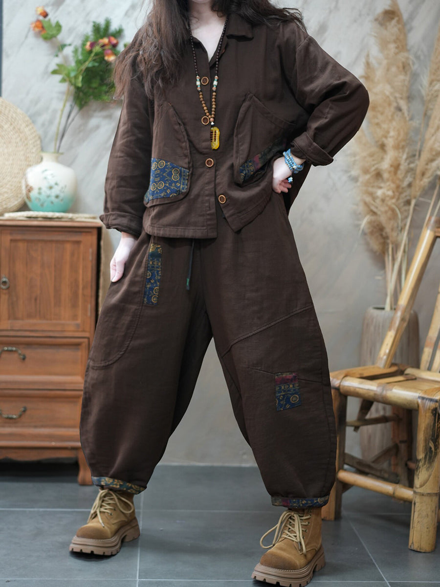 Women Spring Retro Patchwork Turn-down Collar Suits