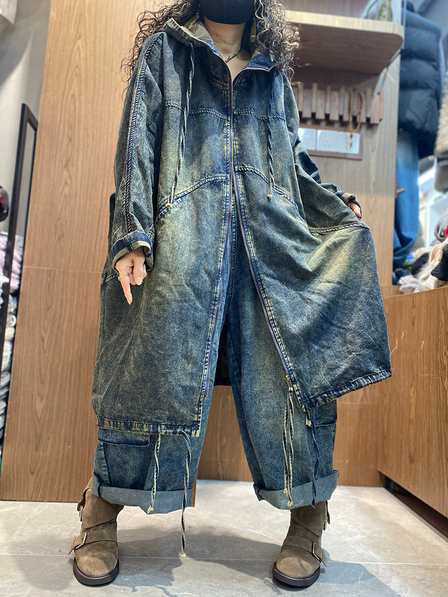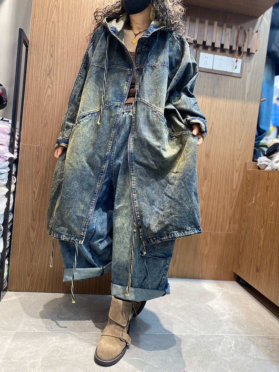 Women Spring Retro Pure Color Hooded Denim Coat