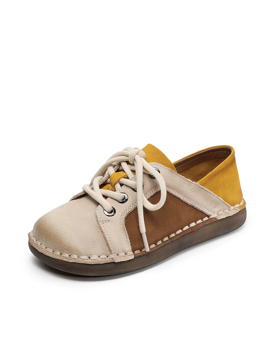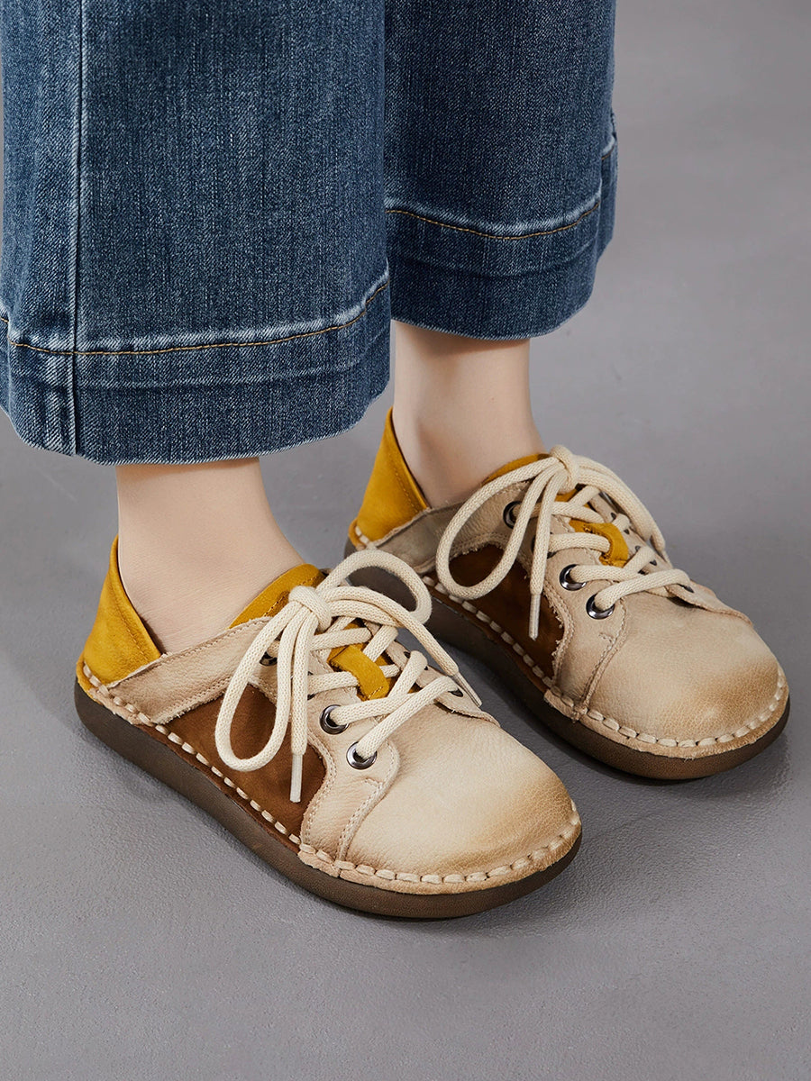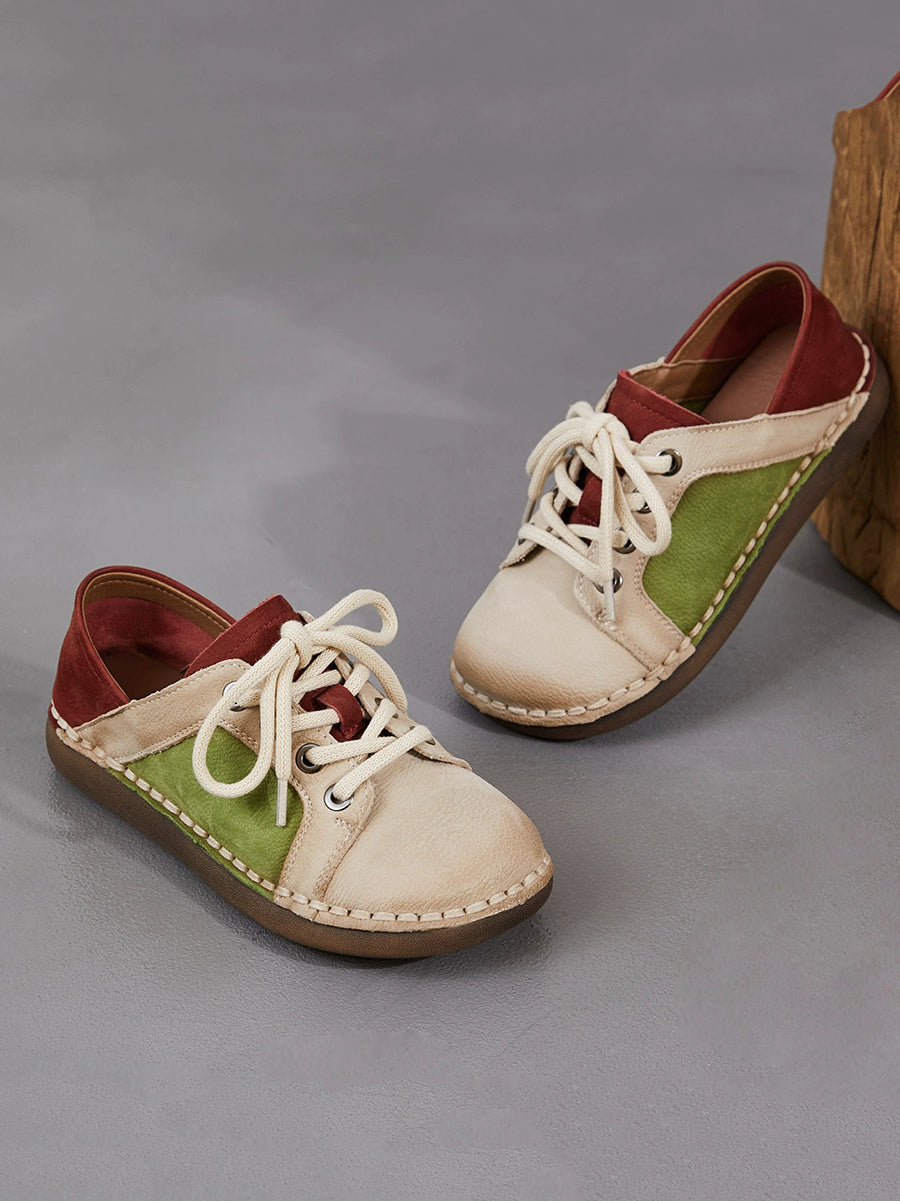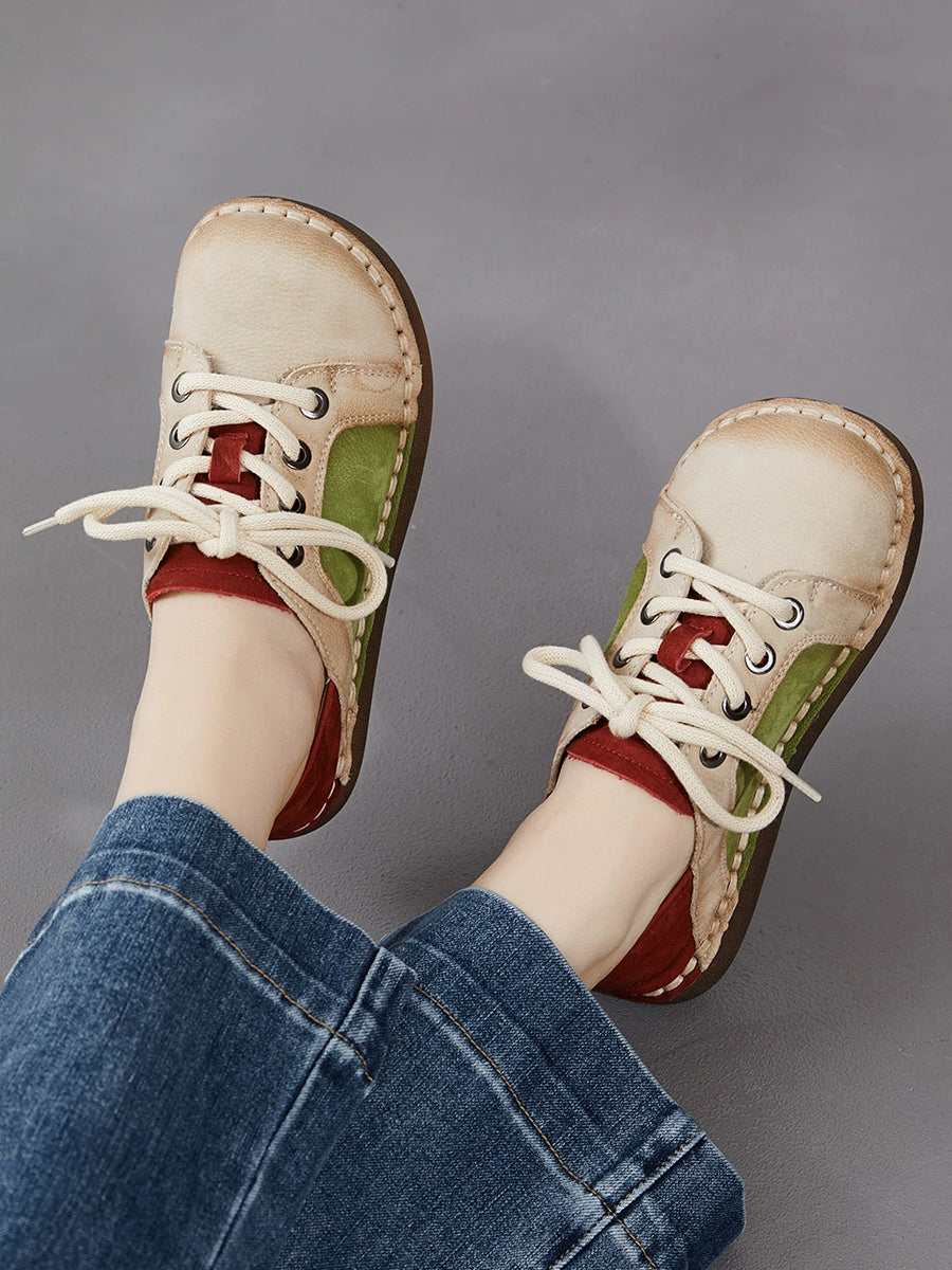 Women Spring Vintage Genuine Leather Spliced Flat Shoes