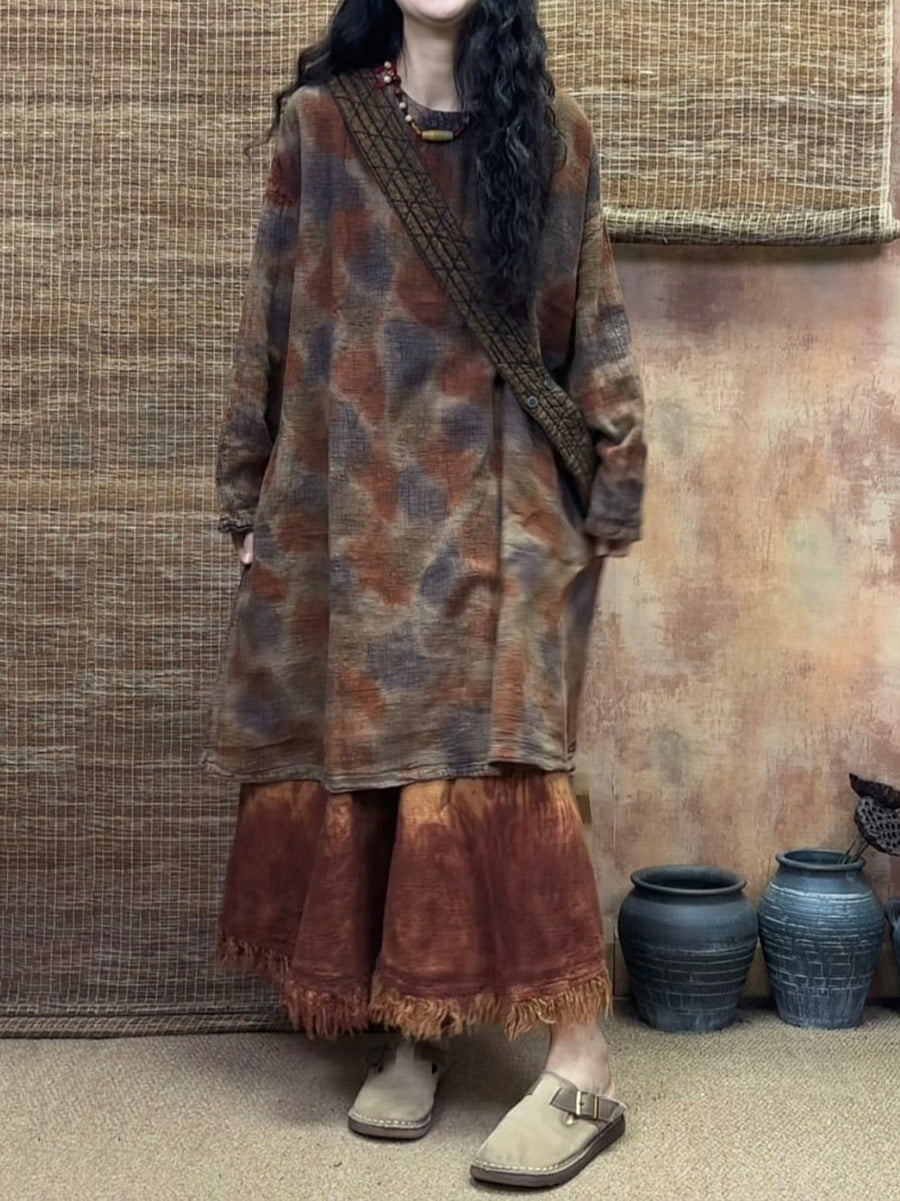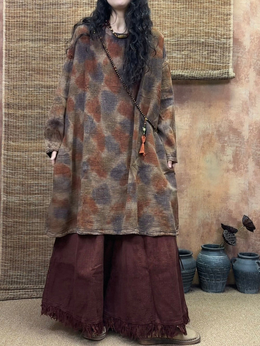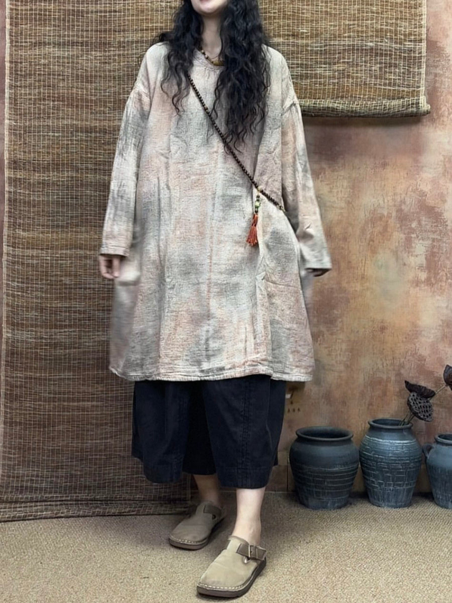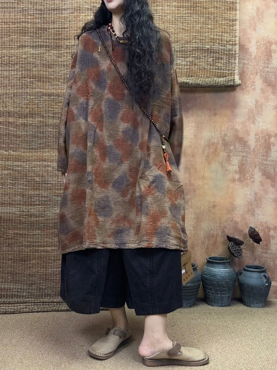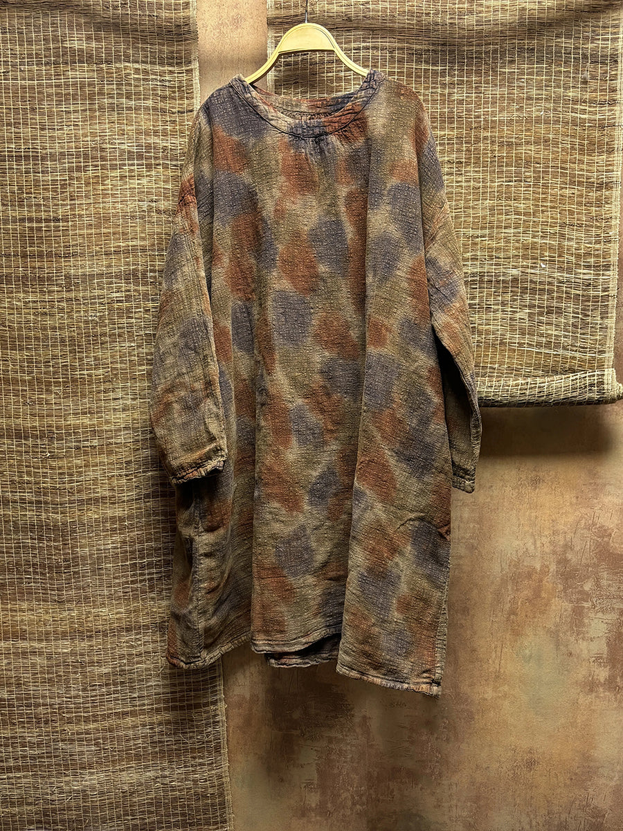 Women Spring Vintage Tie-dye 100%Linen Long Blouse