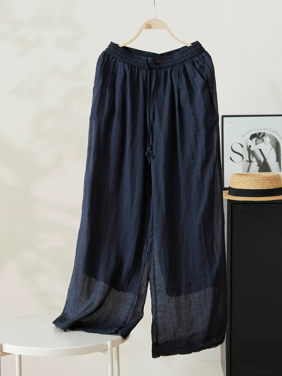 Women Summer Artsy Pure Color 100%Ramie Wide-leg Pants