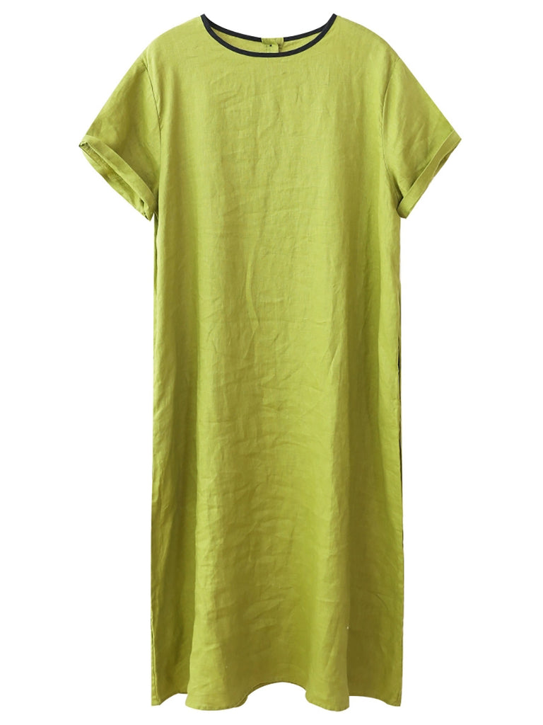 Women Summer Casual Pure Color O-Neck 100%Linen Dress