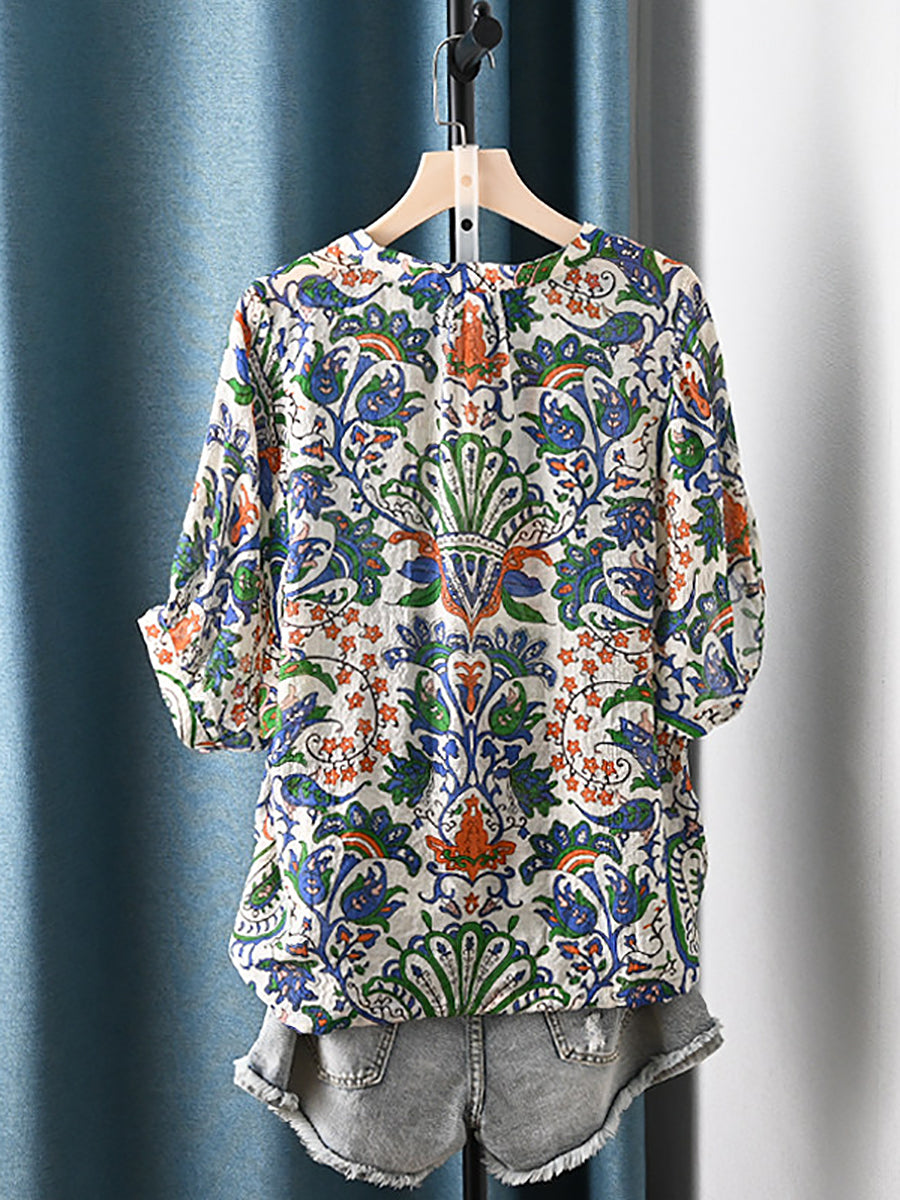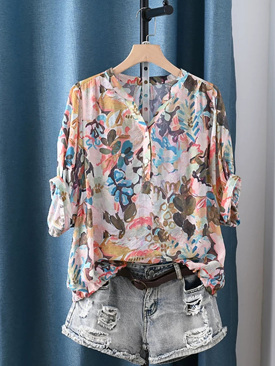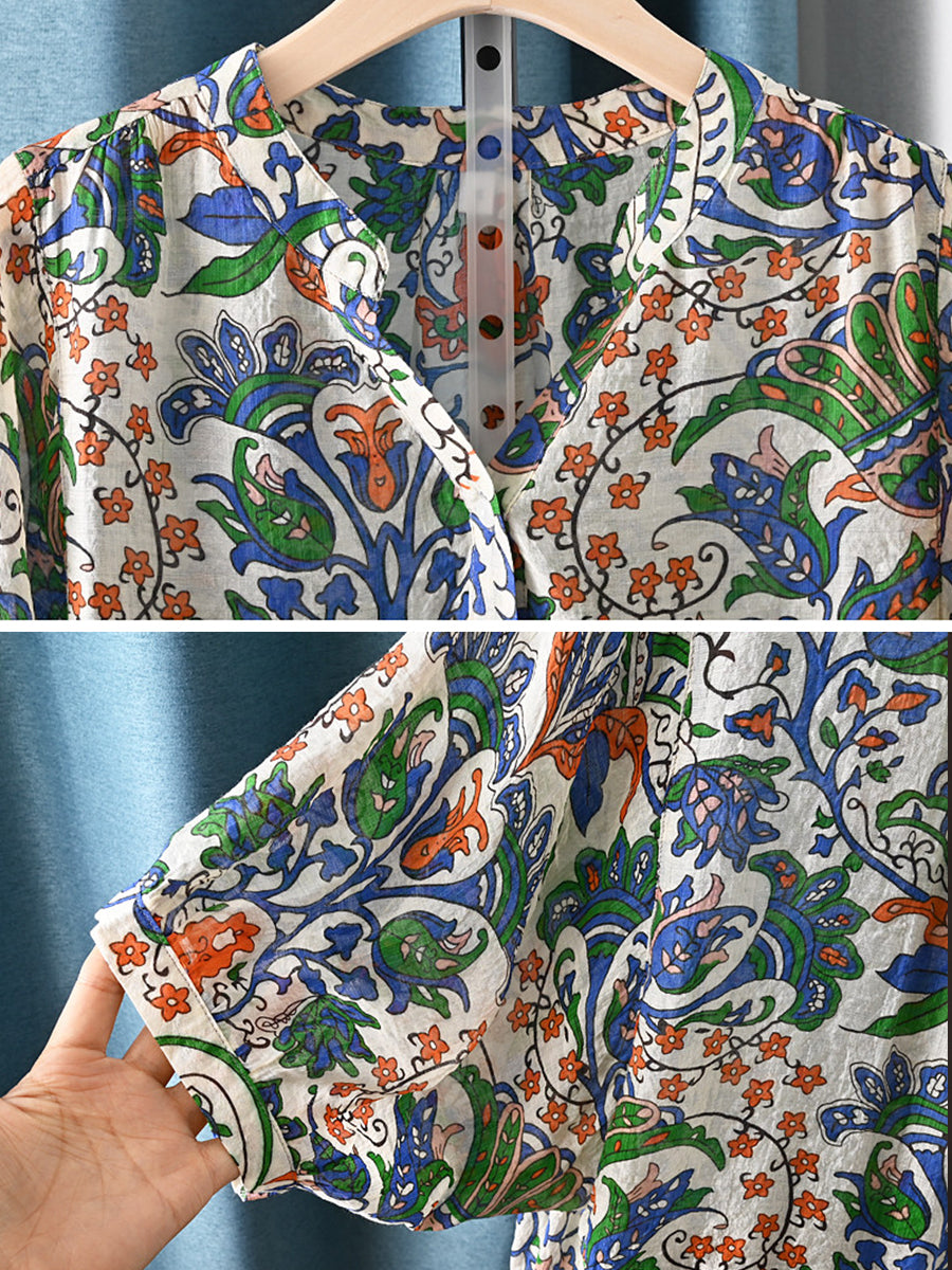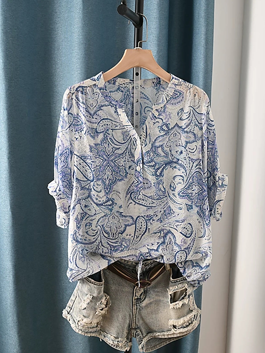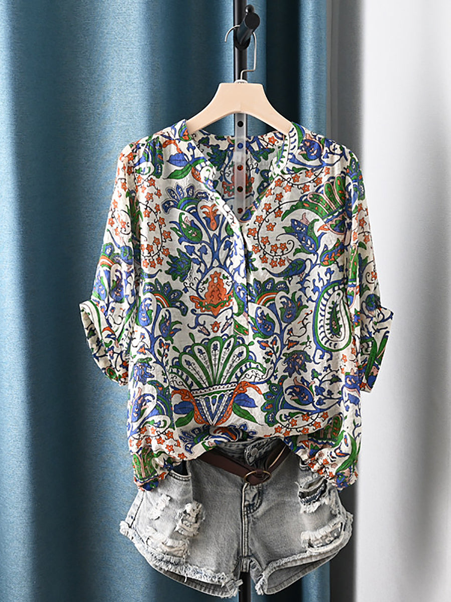 Women Summer Ethnic Flower V-Neck Blouse